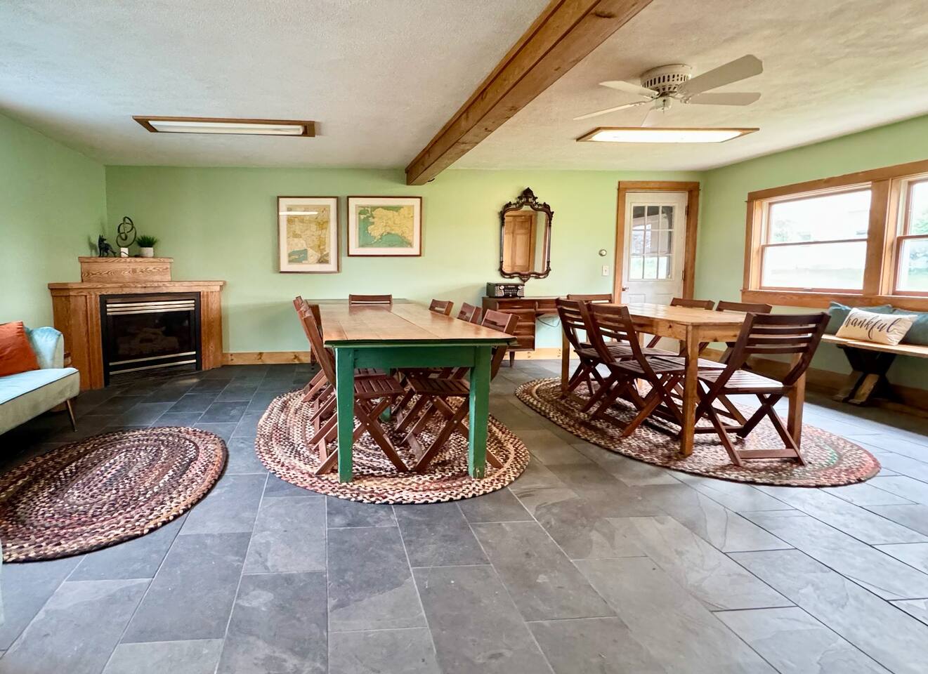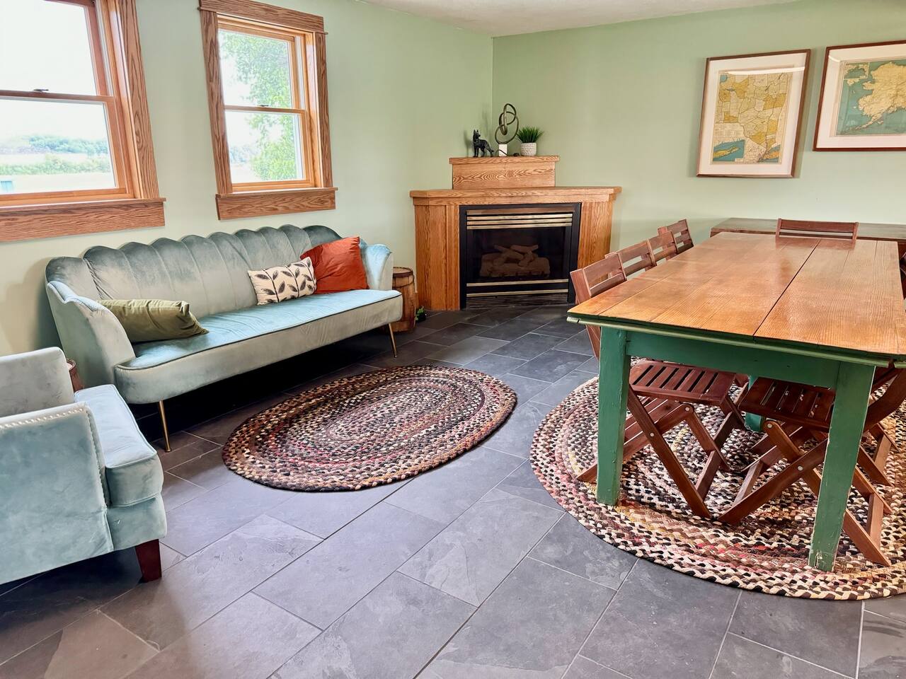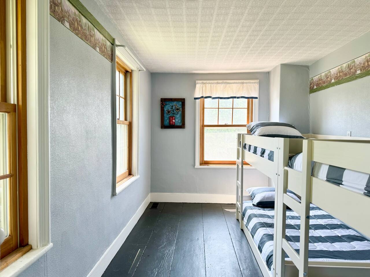 On the main floor you’ll find the eat-in kitchen, living room with couches and a big smart tv, one full spacious bathroom with tub, and two bedrooms. The (free) laundry facilities are off the bathroom. One of the bedrooms on the ground floor has a queen bed, and the other has 2 twins. Also on the ground floor we have a large dining room with seating for up to 22 guests. This is the perfect gathering spot, with great views of the property and neighboring farm. The main upstairs has a full bathroom and three bedrooms - one with a king bed, another with a king plus a twin, and the final bedroom has 2 sets of bunk beds (4 twins). The second upstairs area, above the kitchen, is a great hideaway for kids - it’s a cozy playroom with games and toys. Please note that we cannot host more than 10 overnight guests as per the town regulations.
