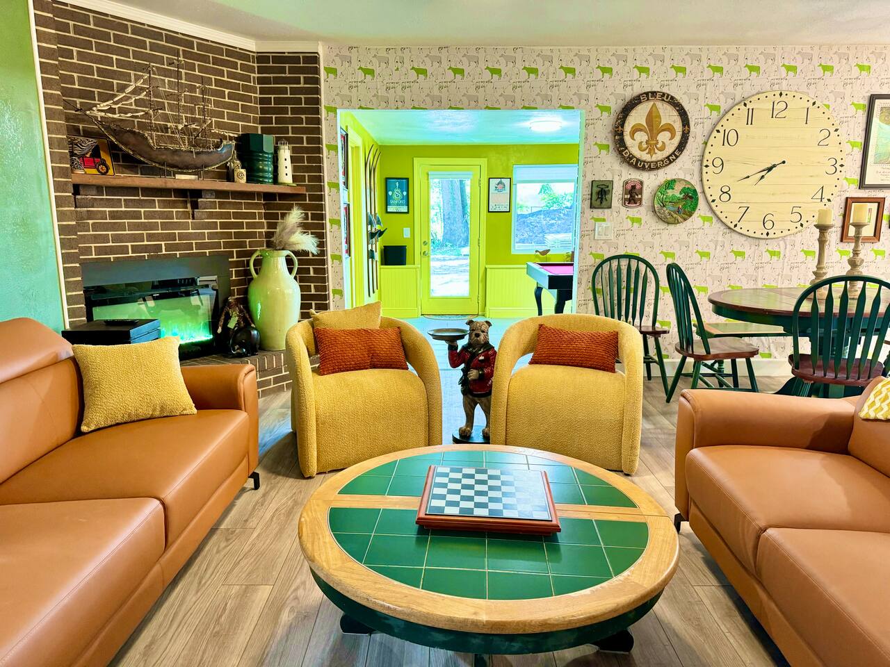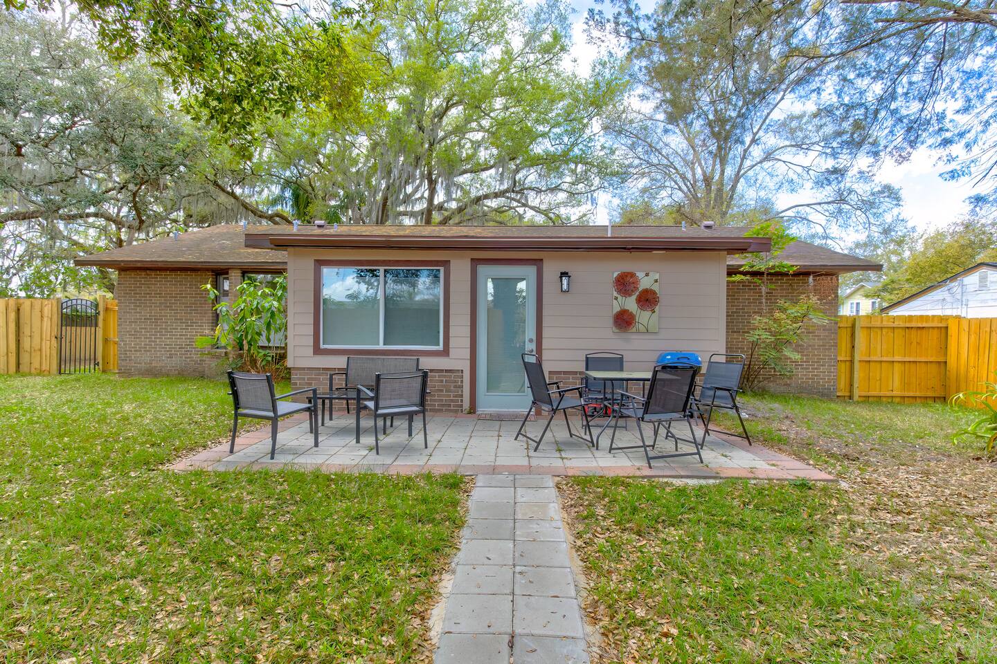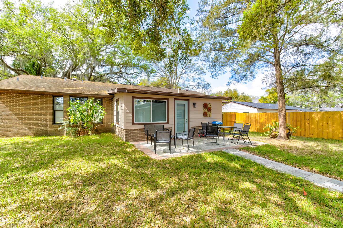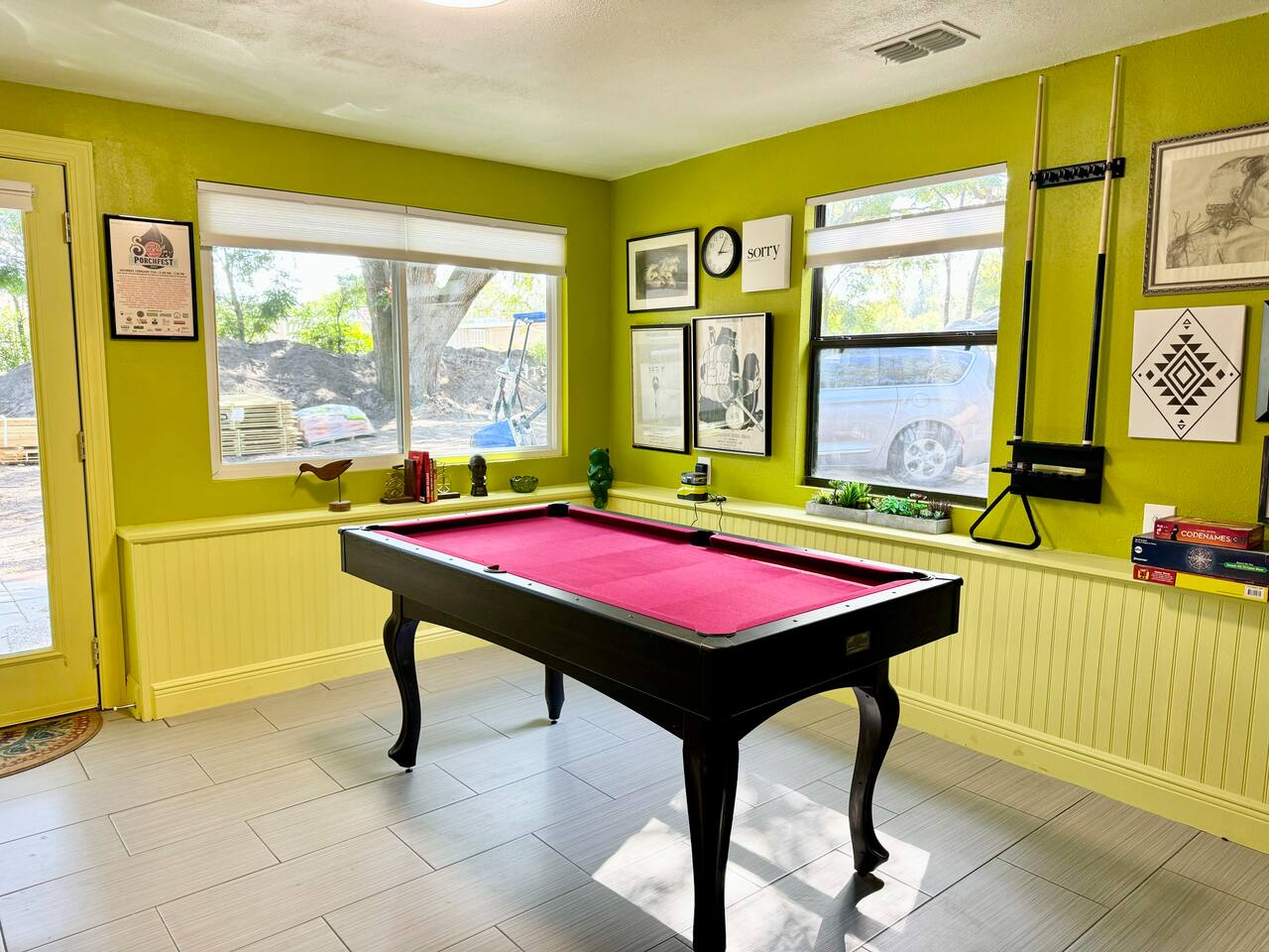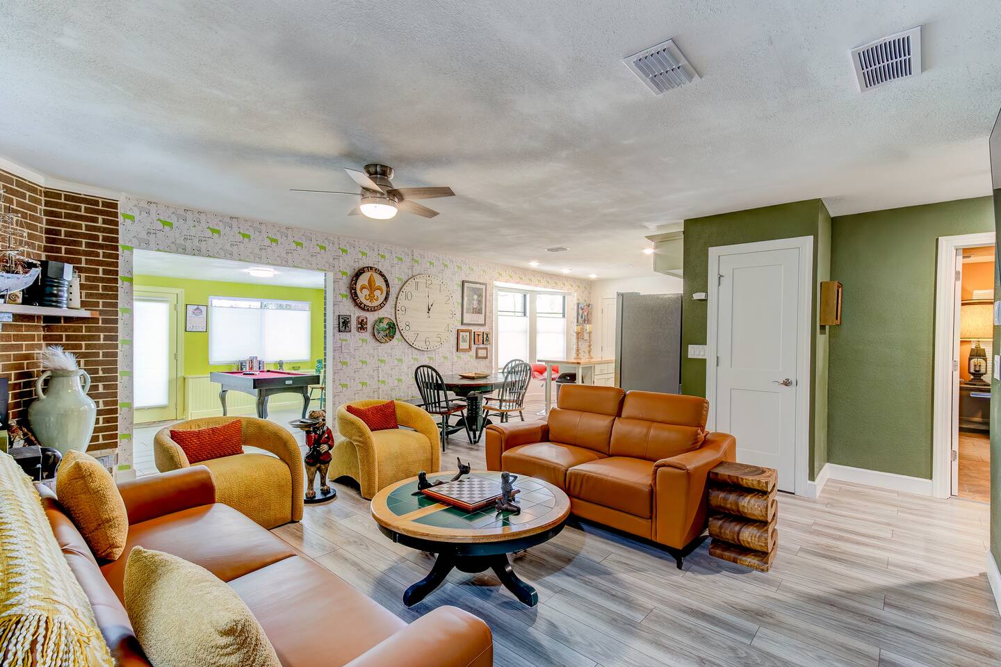 This single-story home is perfect for families, groups, or anyone seeking a fun and unique stay. Enter into the open living/dining area, which flows seamlessly into a modern kitchen with all-new appliances. To your right is the main bedroom, complete with a king bed, twin bed, walk-in closet, and private bathroom with a shower (no tub). On the other side of the house, you’ll find three additional bedrooms: one with a king bed and two bedrooms each with 2 twin beds. These three bedrooms each have a TV. These rooms share a full bathroom with a shower. The living room leads to the billiard room, filled with books and board games—ideal for game nights. Here, you’ll also find a third full bathroom featuring a luxuriously large bathtub. Step outside to the fully fenced backyard, perfect for outdoor dining and relaxation. The patio includes a dining table, making it a great spot for meals or evening drinks under the stars. Beyond the backyard fence, there’s a garage with space for one car, and additional cars can park in the driveway behind the fence. Located just a short walk from downtown Sanford, you’re minutes away from charming shops, delicious restaurants, popular breweries, and the waterfront. This home’s vibrant decor and unique details make it a memorable space for your stay in Sanford!