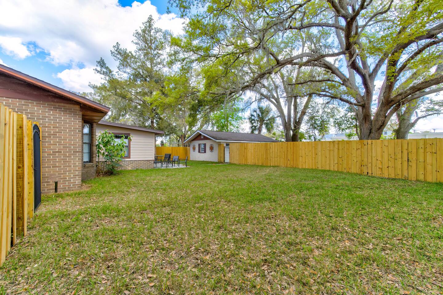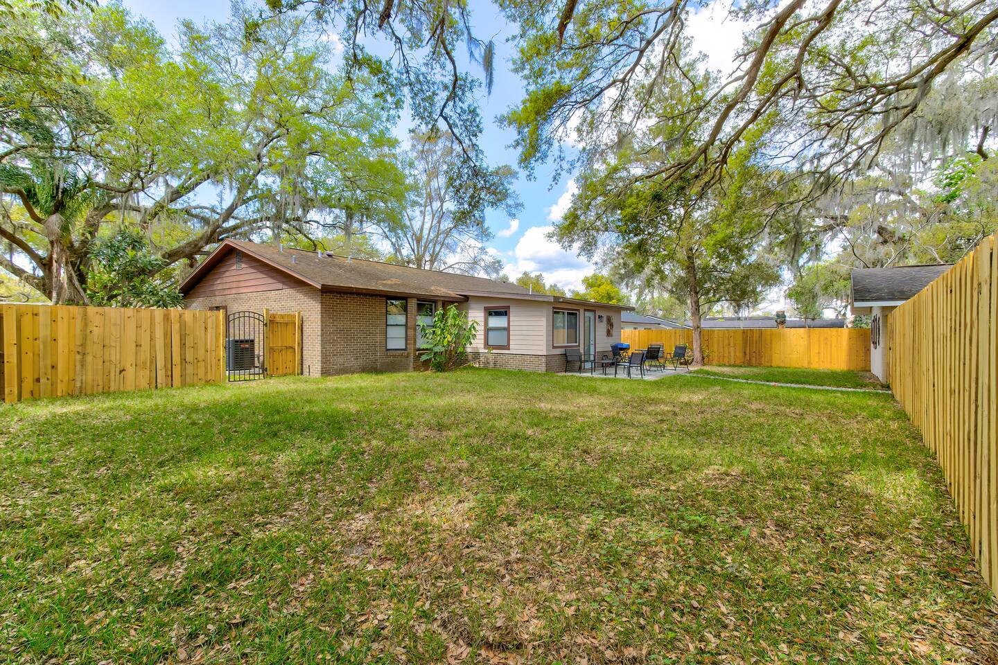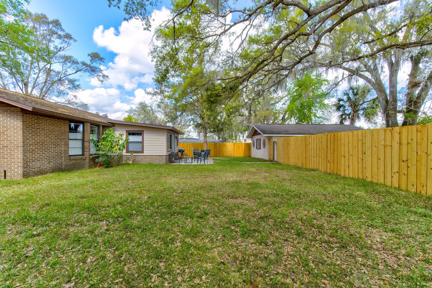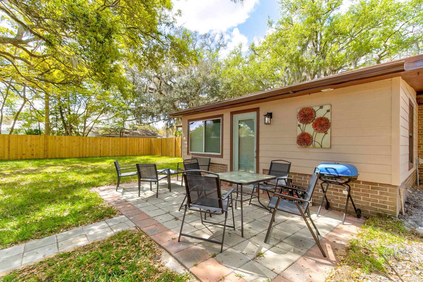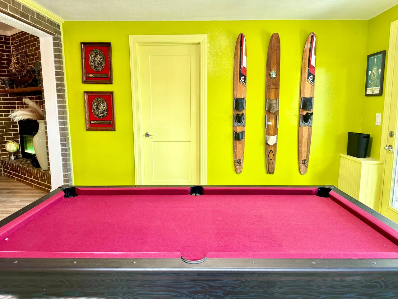 This single-story home is perfect for families, groups, or anyone seeking a fun and unique stay. Enter into the open living/dining area, which flows seamlessly into a modern kitchen with all-new appliances. To your right is the main bedroom, complete with a king bed, twin bed, walk-in closet, and private bathroom with a shower (no tub). On the other side of the house, you’ll find three additional bedrooms: one with a king bed and two bedrooms each with 2 twin beds. These three bedrooms each have a TV. These rooms share a full bathroom with a shower. The living room leads to the billiard room, filled with books and board games—ideal for game nights. Here, you’ll also find a third full bathroom featuring a luxuriously large bathtub. Step outside to the fully fenced backyard, perfect for outdoor dining and relaxation. The patio includes a dining table, making it a great spot for meals or evening drinks under the stars. Beyond the backyard fence, there’s a garage with space for one car, and additional cars can park in the driveway behind the fence. Located just a short walk from downtown Sanford, you’re minutes away from charming shops, delicious restaurants, popular breweries, and the waterfront. This home’s vibrant decor and unique details make it a memorable space for your stay in Sanford!