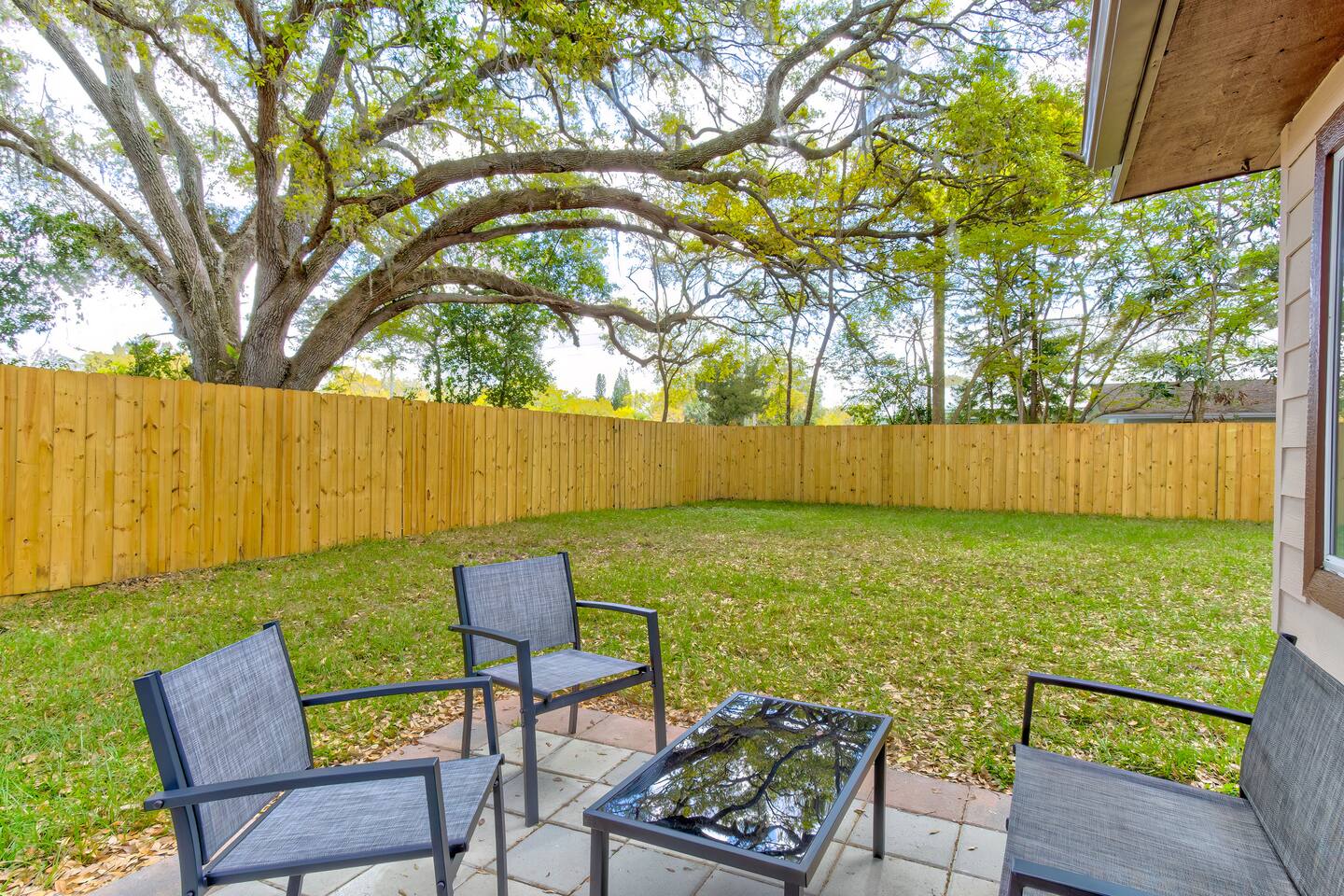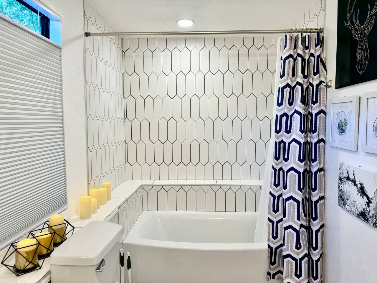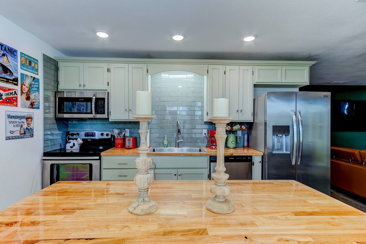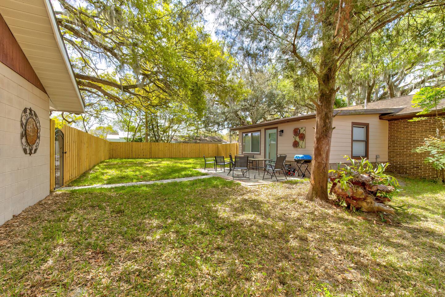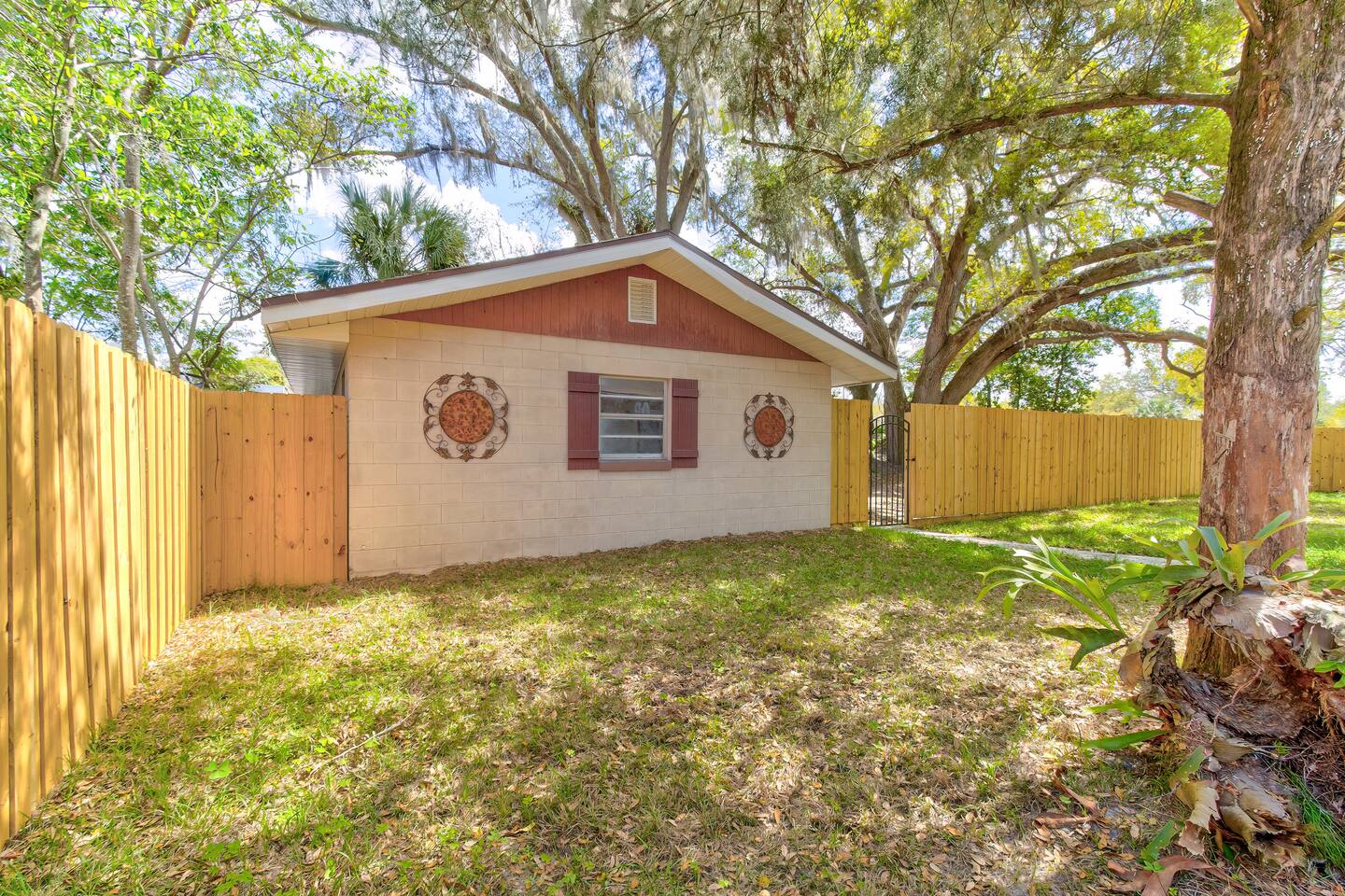 This single-story home is perfect for families, groups, or anyone seeking a fun and unique stay. Enter into the open living/dining area, which flows seamlessly into a modern kitchen with all-new appliances. To your right is the main bedroom, complete with a king bed, twin bed, walk-in closet, and private bathroom with a shower (no tub). On the other side of the house, you’ll find three additional bedrooms: one with a king bed and two bedrooms each with 2 twin beds. These three bedrooms each have a TV. These rooms share a full bathroom with a shower. The living room leads to the billiard room, filled with books and board games—ideal for game nights. Here, you’ll also find a third full bathroom featuring a luxuriously large bathtub. Step outside to the fully fenced backyard, perfect for outdoor dining and relaxation. The patio includes a dining table, making it a great spot for meals or evening drinks under the stars. Beyond the backyard fence, there’s a garage with space for one car, and additional cars can park in the driveway behind the fence. Located just a short walk from downtown Sanford, you’re minutes away from charming shops, delicious restaurants, popular breweries, and the waterfront. This home’s vibrant decor and unique details make it a memorable space for your stay in Sanford!