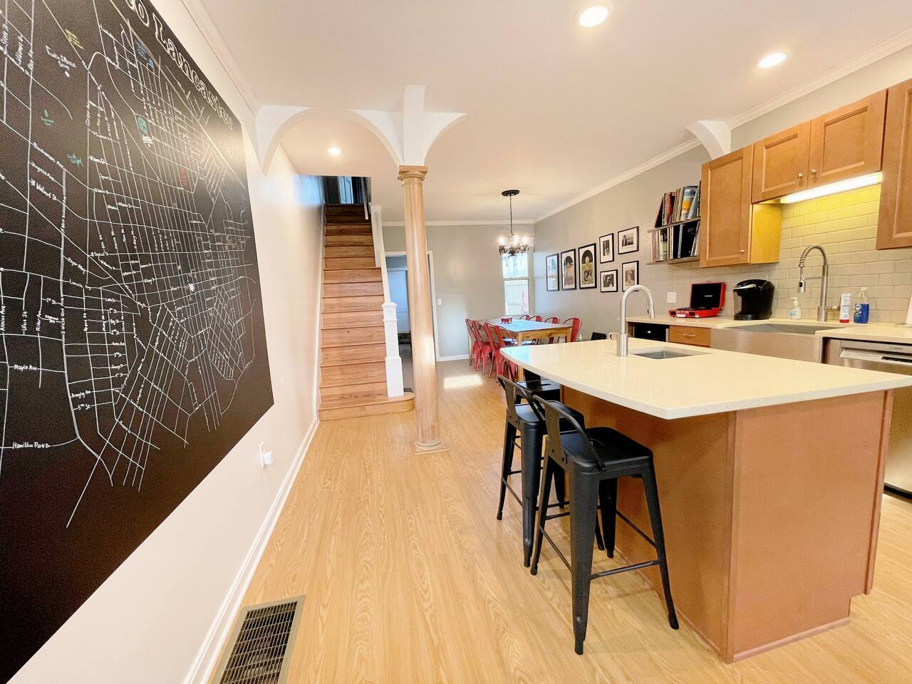 You’ll have the entire 3-story row house to yourself. It is at the end of the row houses, so there are more windows than the typical Lancaster home. Lancaster row homes are tall and thin, which means we do have 2 steep staircases. I would not recommend staying here if you have a hard time with stairs. On the main floor, you'll find a well-stocked eat-in kitchen, a dining room with seating for 8, and a cozy living room with a TV—perfect for relaxing after a day of exploring. A convenient half-bathroom with a washer and dryer is just off the living room. Upstairs on the second floor, you’ll find a spacious bedroom with a king bed, a second bedroom with a full-size bed, and a spa-like full bathroom featuring a jetted tub and a luxurious steam shower. The third floor offers a versatile sleeping setup with a king bed, plus a twin bed and a twin trundle—ideal for families or groups. Whether you're here to unwind or adventure, this space is designed to make you feel right at home. The backyard is a lovely spot, fully-fenced in for pups and kids. In the fall, we sometimes have an overabundance of yummy apples from the large, mature apple tree. Please note that we do not have on-site parking, but we do have easy access to free street parking around the clock. It is typically very easy to park right in front of the house. Please take note of the parking signs, because there are some restrictions due to street cleaning.