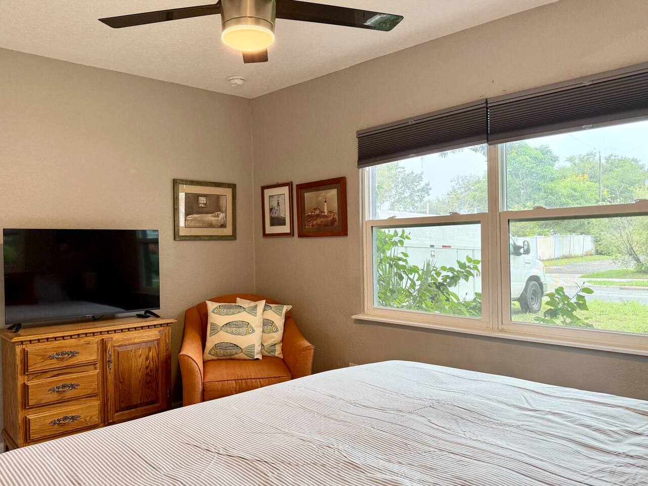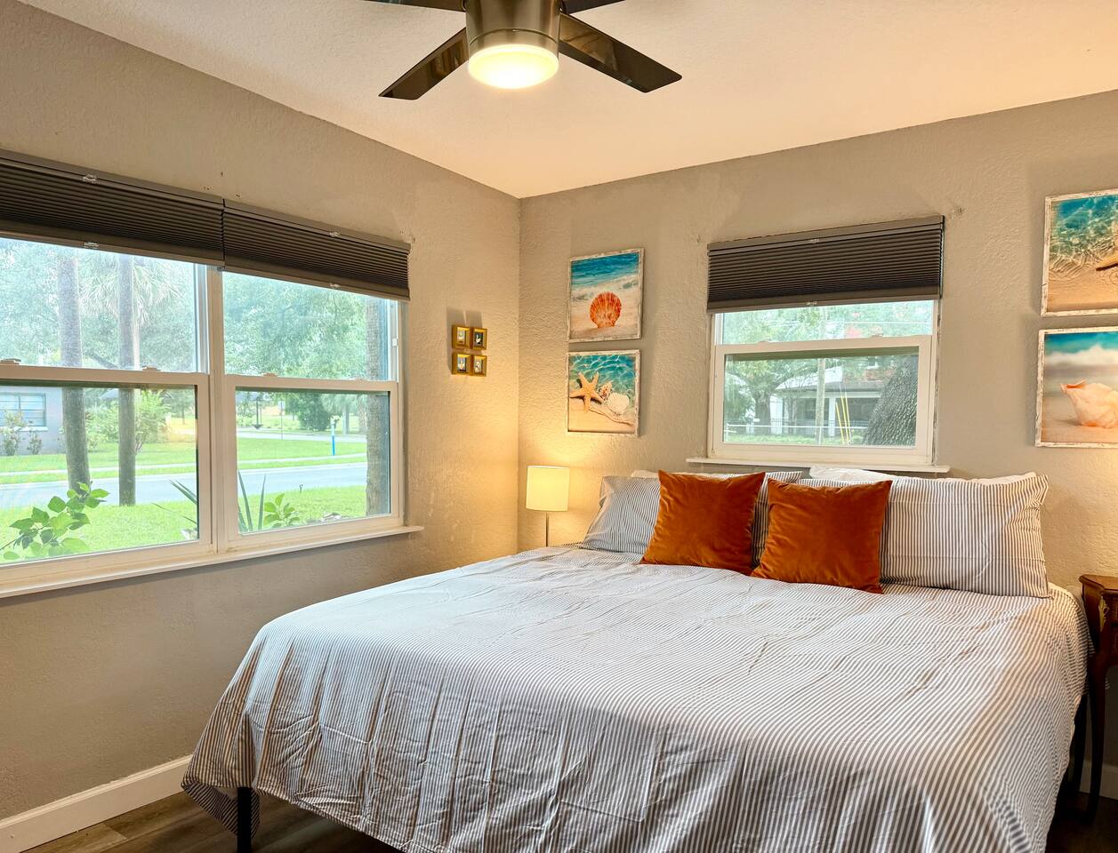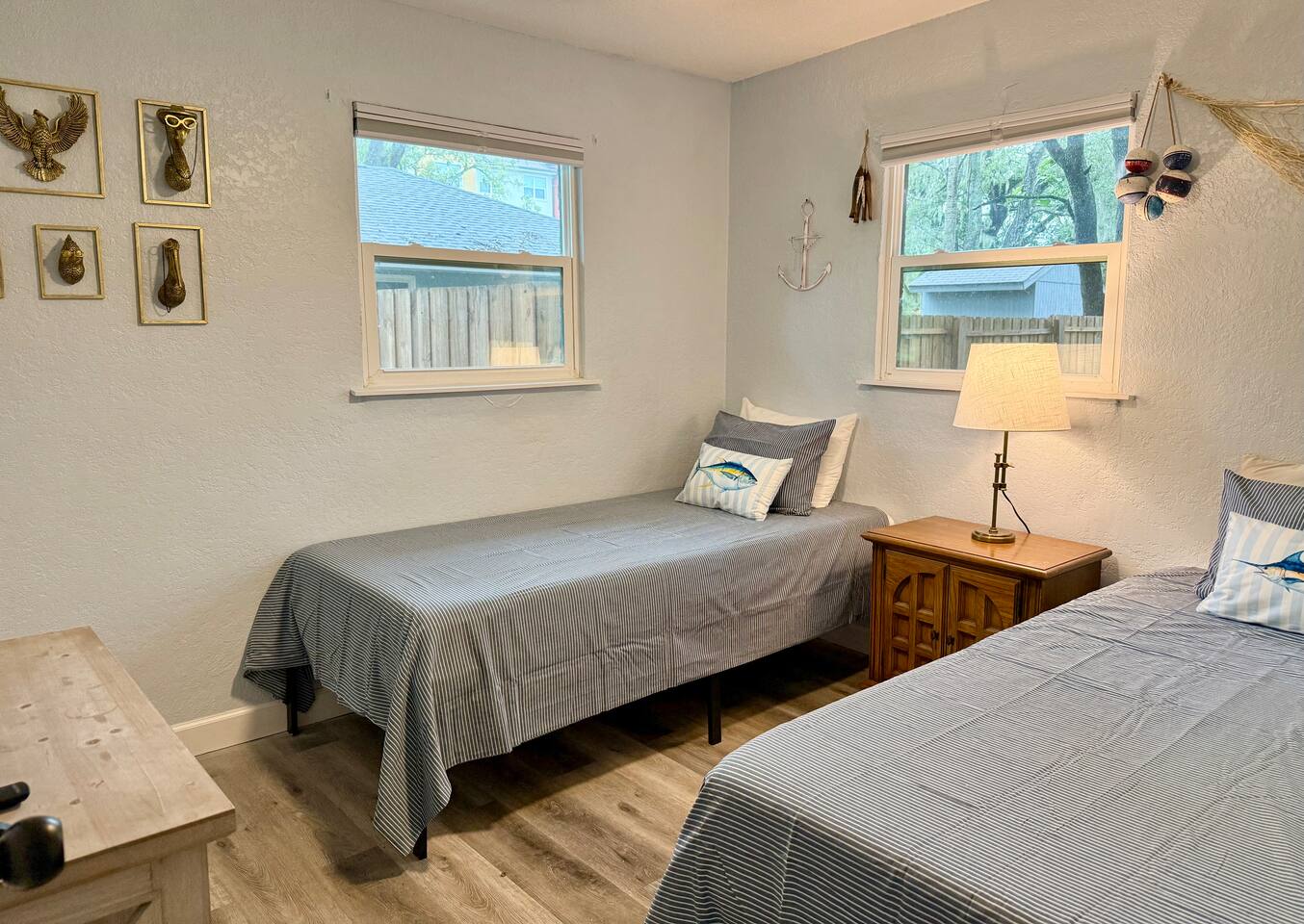 Welcome to your Sanford getaway! Step inside this charming nautical-themed home and feel instantly at ease. The living room sits straight ahead, featuring a large smart TV, a queen-size futon for extra sleeping space, and a convenient desk for remote work. A brand-new full bathroom with a walk-in shower is located just off the living room. Sliding glass doors open directly to the expansive, fully fenced backyard where you’ll find an outdoor sofa and dining table. Kids will love the play structure with a slide and swings, and the most adorable playhouse (both are ideal for kids under 10 years old). Back toward the entryway, you’ll find the kitchen and dining area. The dining table seats six, and the kitchen is equipped with brand-new stainless steel appliances. It’s fully stocked with dishes, utensils, cookware, and everything you need to prepare meals during your stay. Down the hall are three bedrooms: two with king-size beds and one with two twin beds. The twin beds can be pushed together to create another king upon request, and we’ll happily provide king bedding. Each bedroom includes a new smart TV for your comfort and entertainment. At the end of the hall is a second full bathroom with a tub, ideal for families traveling with children. This home is located in a quiet Sanford neighborhood, just minutes from Lake Monroe, Ft. Mellon Park, and downtown dining and shops. It is not suited for rowdy groups, but it’s the perfect retreat for families, business travelers, or solo guests seeking a peaceful and comfy stay.