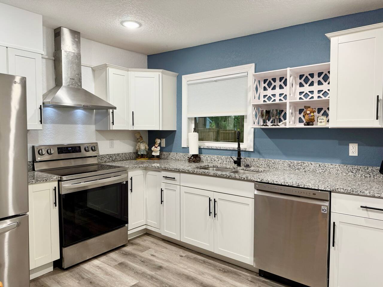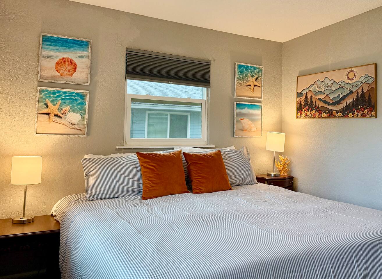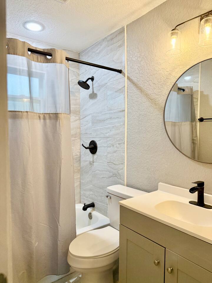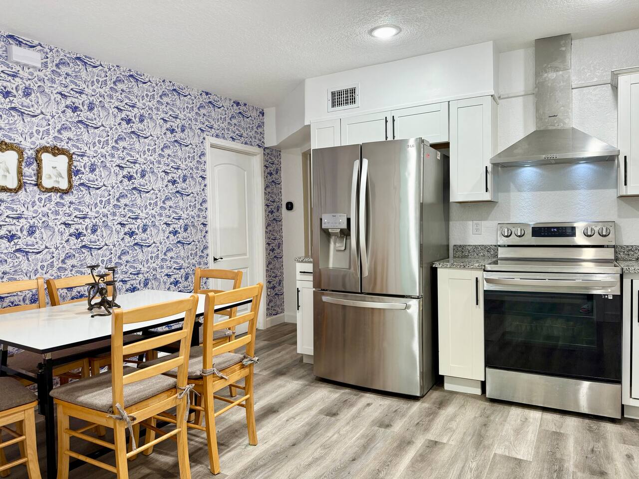 Welcome to your Sanford getaway! Step inside this charming nautical-themed home and feel instantly at ease. The living room sits straight ahead, featuring a large smart TV, a queen-size futon for extra sleeping space, and a convenient desk for remote work. A brand-new full bathroom with a walk-in shower is located just off the living room. Sliding glass doors open directly to the expansive, fully fenced backyard where you’ll find an outdoor sofa and dining table. Kids will love the play structure with a slide and swings, and the most adorable playhouse (both are ideal for kids under 10 years old). Back toward the entryway, you’ll find the kitchen and dining area. The dining table seats six, and the kitchen is equipped with brand-new stainless steel appliances. It’s fully stocked with dishes, utensils, cookware, and everything you need to prepare meals during your stay. Down the hall are three bedrooms: two with king-size beds and one with two twin beds. The twin beds can be pushed together to create another king upon request, and we’ll happily provide king bedding. Each bedroom includes a new smart TV for your comfort and entertainment. At the end of the hall is a second full bathroom with a tub, ideal for families traveling with children. This home is located in a quiet Sanford neighborhood, just minutes from Lake Monroe, Ft. Mellon Park, and downtown dining and shops. It is not suited for rowdy groups, but it’s the perfect retreat for families, business travelers, or solo guests seeking a peaceful and comfy stay.