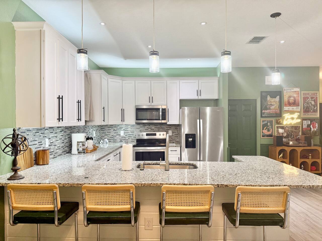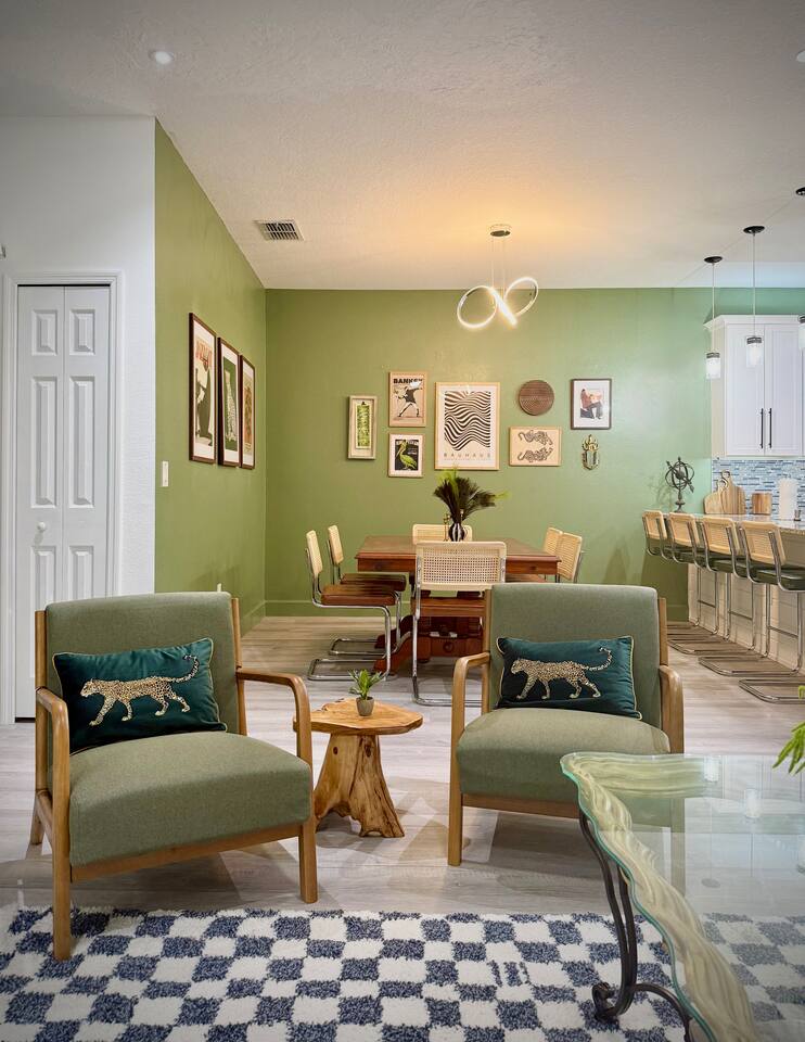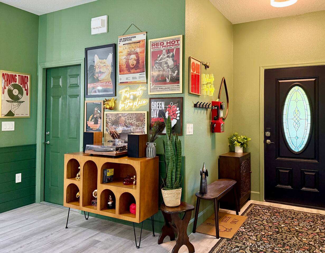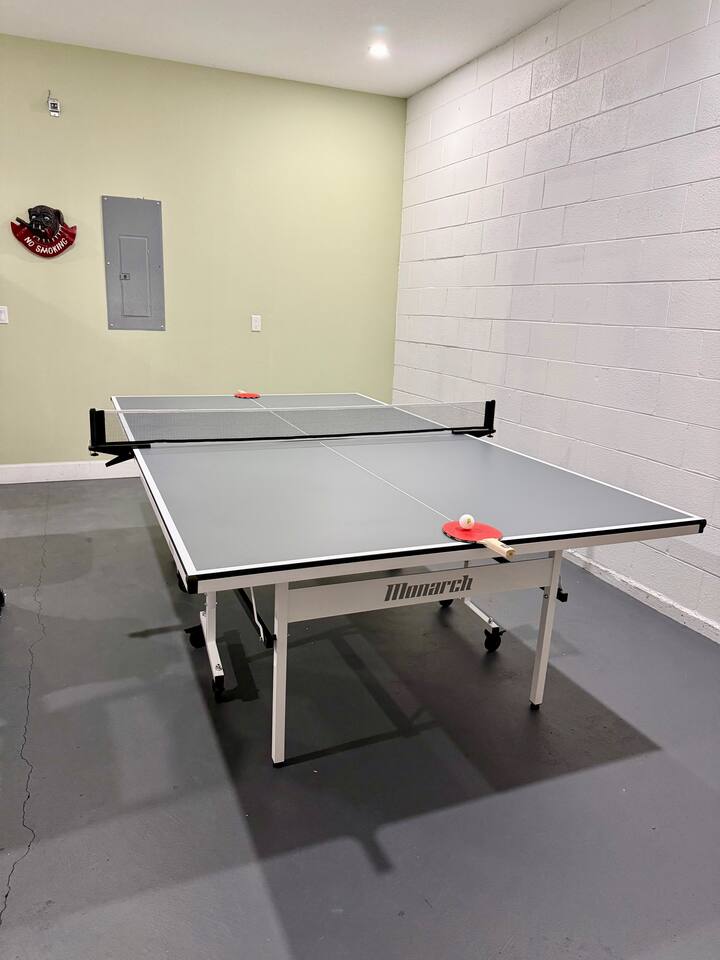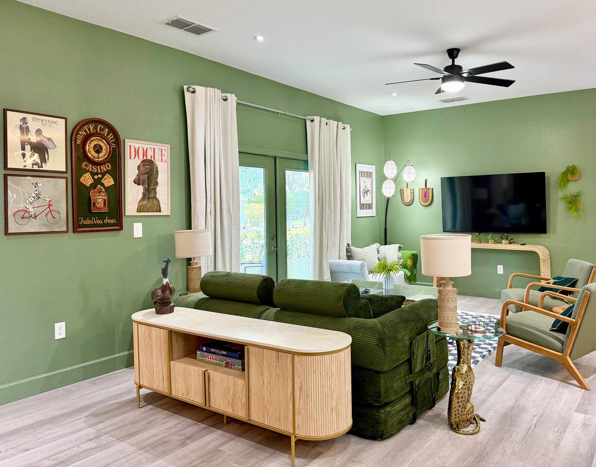 This modern home is tucked into a quiet neighborhood close to historic downtown Sanford and Lake Monroe. It's walkable to the downtown breweries, restaurants, live music, and the RiverWalk. Inside, the home is designed to feel easy and elevated. You’ve got two super comfy king bedrooms that actually feel like an upgrade, plus a third bedroom with two Twin XL beds that work perfectly for friends or kids. With two full bathrooms (including one with a tub), getting ready, or winding down, is never a hassle. The living space is bright, open, and made for hanging out, whether you're streaming a movie, playing games, or putting on a record. The curated vinyl collection adds a little extra character for slower mornings or relaxed nights in. Every bedroom and the living room has its own TV, so everyone can unwind their own way. Need to stay connected? You’ll have high-speed Starlink internet, so working remotely or streaming is smooth and reliable - no slowdowns, no stress. The kitchen is fully set up with everything you need to cook and gather, anchored by a large dining table that’s perfect for meals, game nights, or spreading out with a laptop. And mornings here hit different thanks to a fully stocked coffee setup with drip coffee, a French press, milk frother, and Starbucks coffee. When it’s time to have some fun, head out to the garage where you’ll find a ping pong table ready for late-night tournaments, or take it outside and enjoy the patio seating area, ideal for coffee in the morning or drinks in the evening. If you’re traveling with kids, there’s a large public playground just a one-minute walk away, making it incredibly easy to get outside without planning a whole outing. Back inside, you’ll also find a collection of board games for relaxed nights in. The location really ties it all together. You’re close enough to walk downtown, but far enough to enjoy the quiet when you need it. Spend your days exploring downtown Sanford, catching sunsets at Lake Monroe, or taking short drives to Orlando, beaches, and natural springs, then come home to a place that actually feels like your own. This is the kind of stay that works whether you're here for a weekend getaway, a longer visit, or a mix of work and downtime. Comfortable, walkable, and just the right amount of fun.