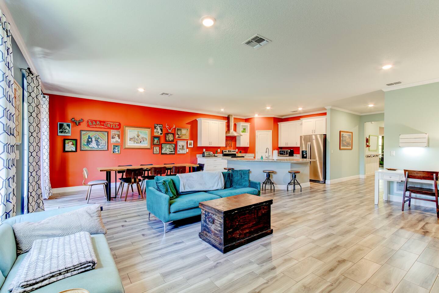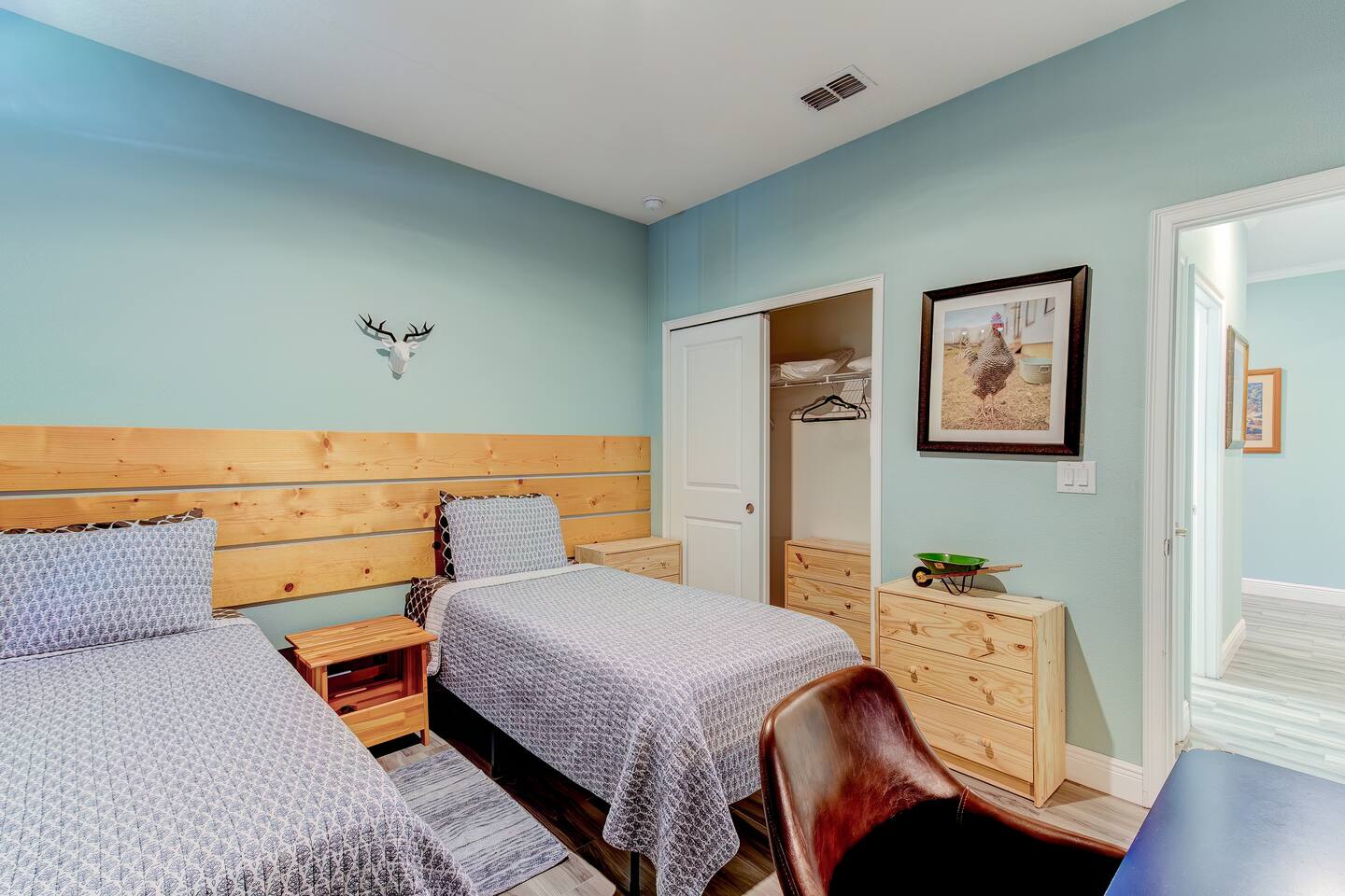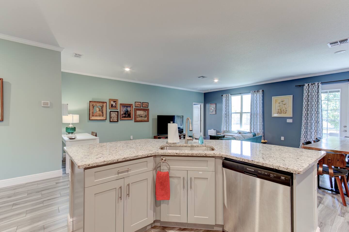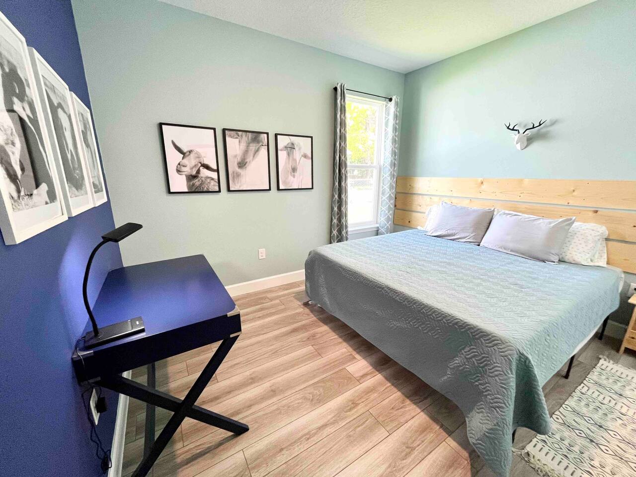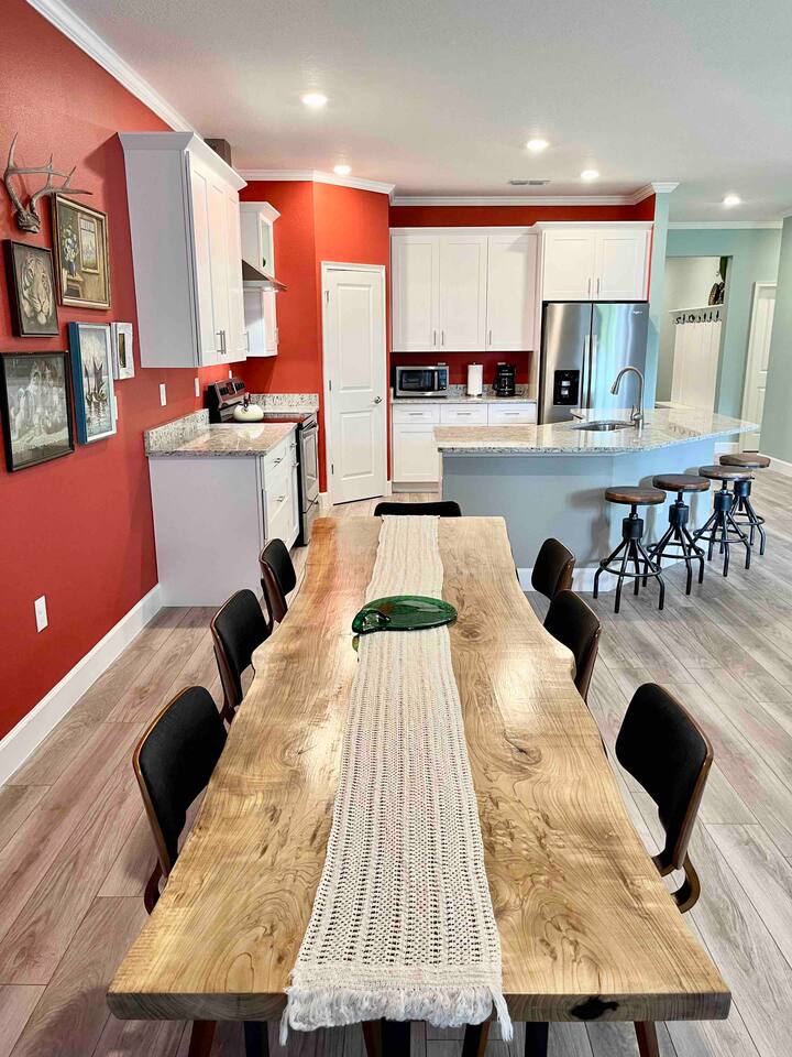 This house is new (construction was finished in 2021). It is bright and sunny, and has an open floor-plan and 4 bedrooms with 3 full bathrooms. The main bedroom suite has a king bed, large bathroom, and walk-in closet. With versatile bedrooms, everyone is sure to be comfy: two of the bedrooms can set up as either a king or 2 twin XL beds. The 4th bedroom is set up as an office, but the couch folds out to a twin-size bed, and a mattress topper is provided so it can be comfy for our long-term guests. A spare twin folding cot bed is also provided.