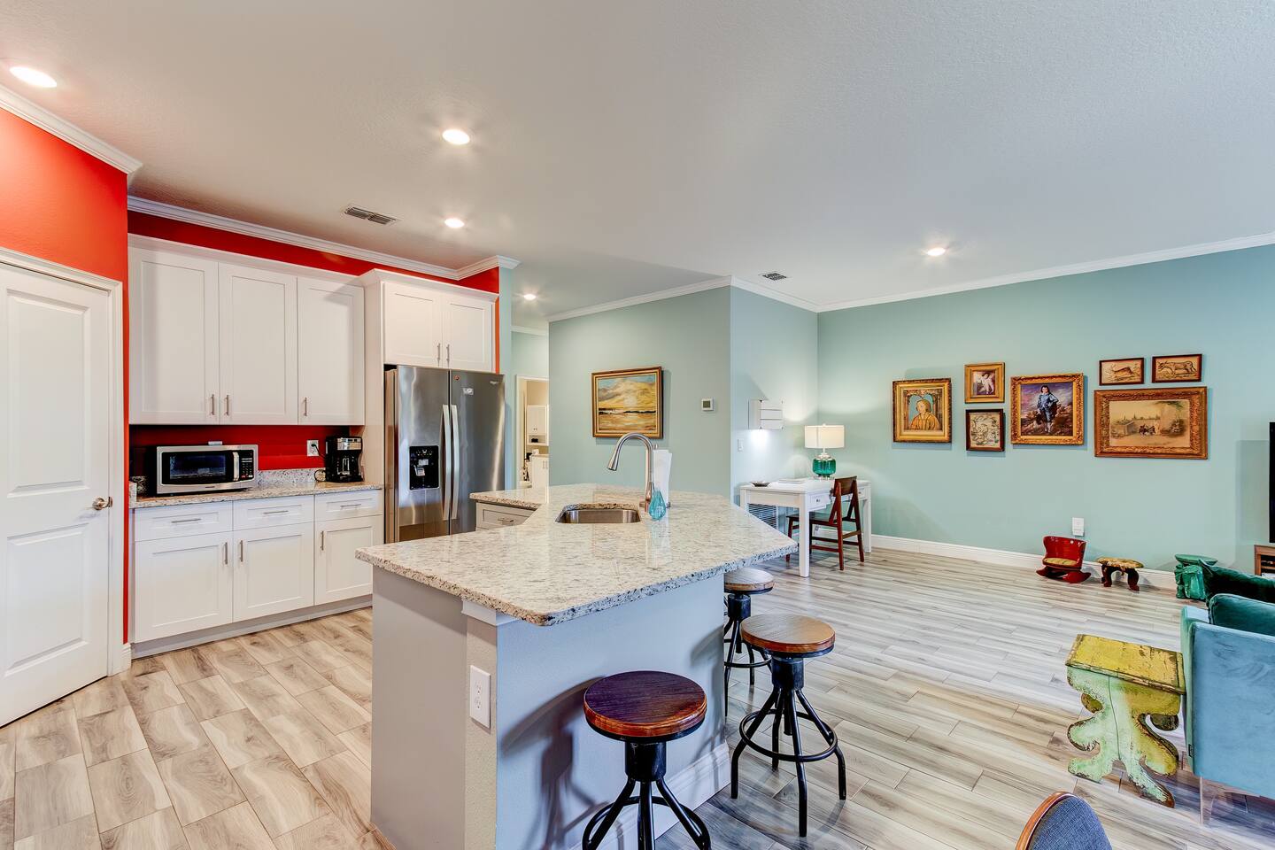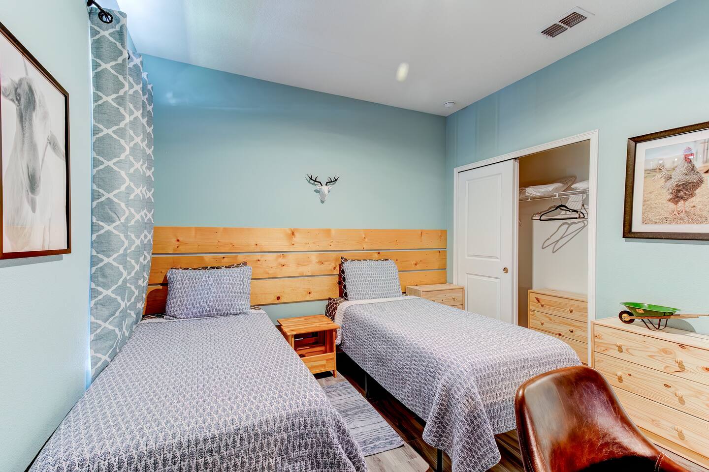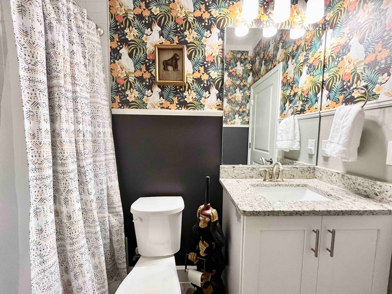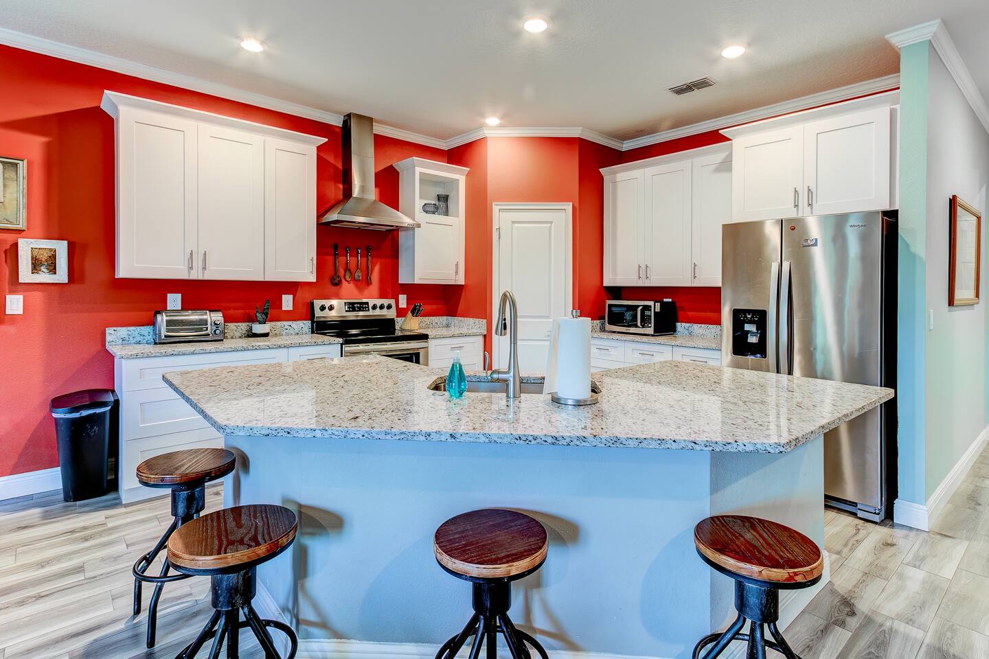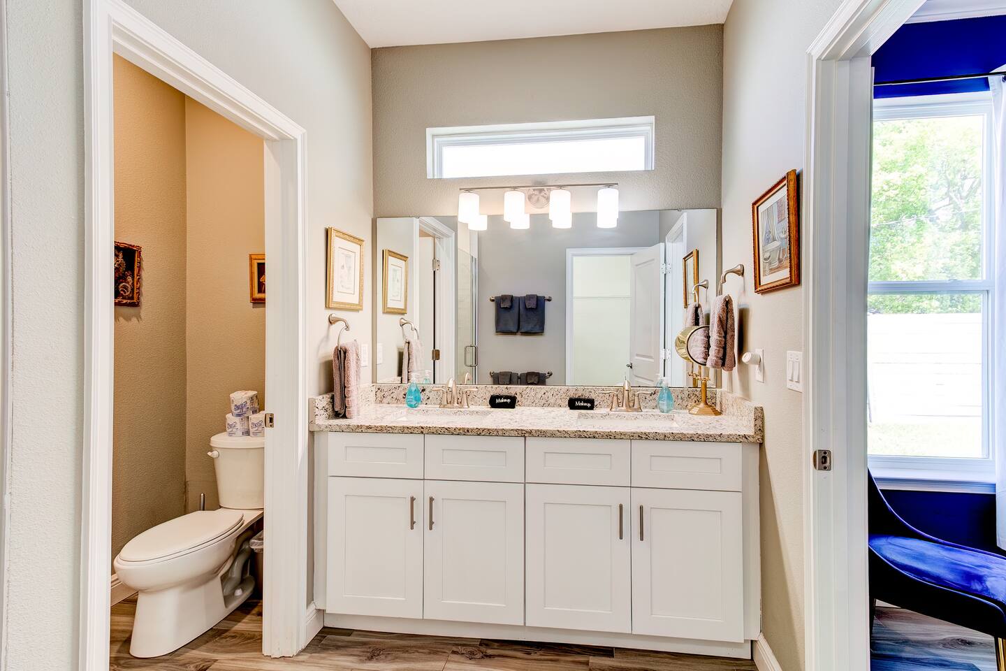 This house is new (construction was finished in 2021). It is bright and sunny, and has an open floor-plan and 4 bedrooms with 3 full bathrooms. The main bedroom suite has a king bed, large bathroom, and walk-in closet. With versatile bedrooms, everyone is sure to be comfy: two of the bedrooms can set up as either a king or 2 twin XL beds. The 4th bedroom is set up as an office, but the couch folds out to a twin-size bed, and a mattress topper is provided so it can be comfy for our long-term guests. A spare twin folding cot bed is also provided.