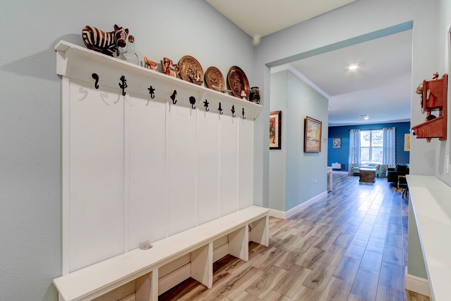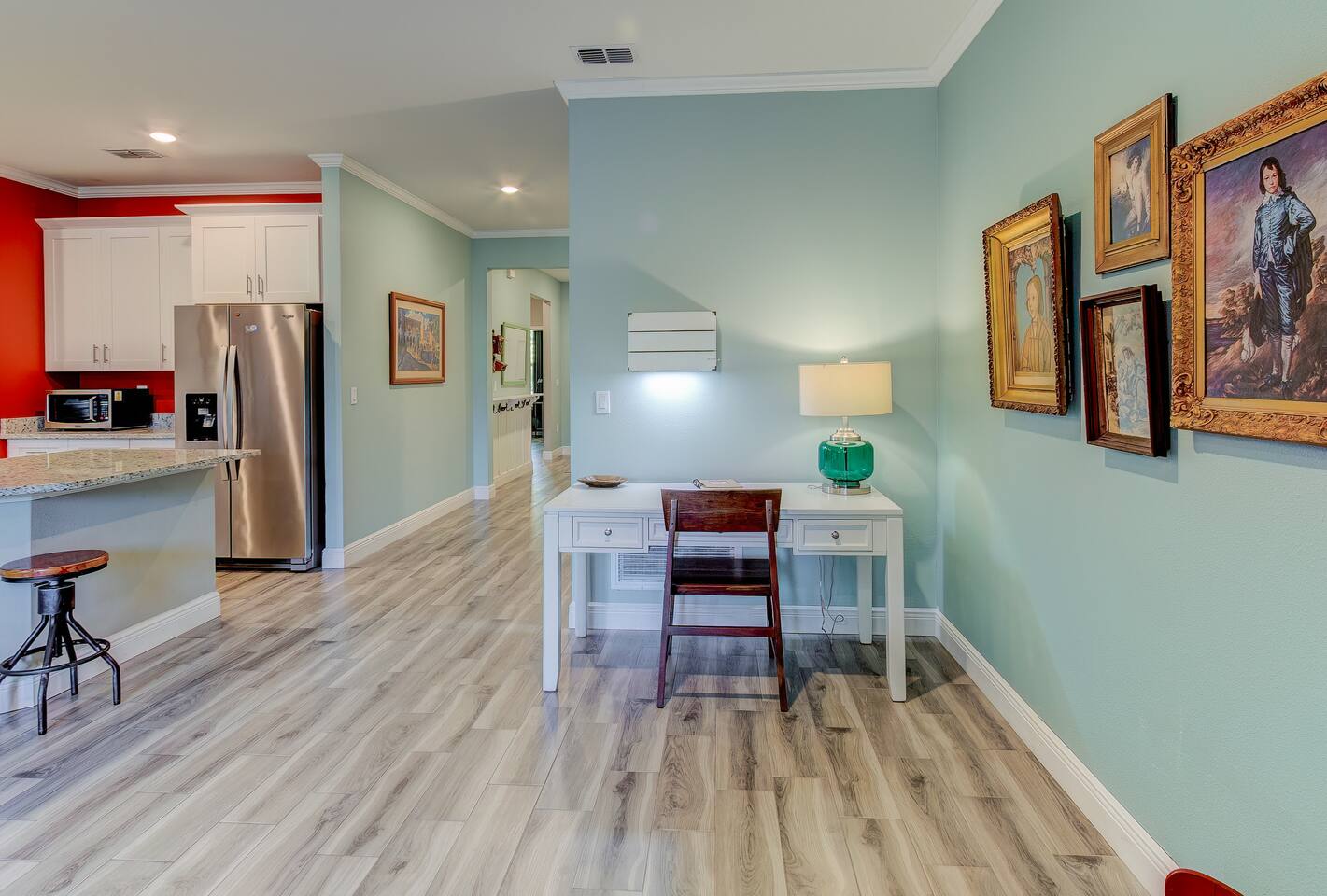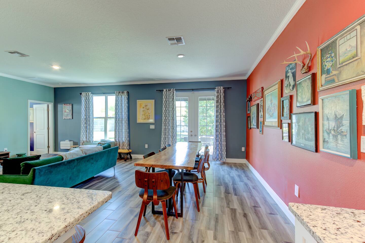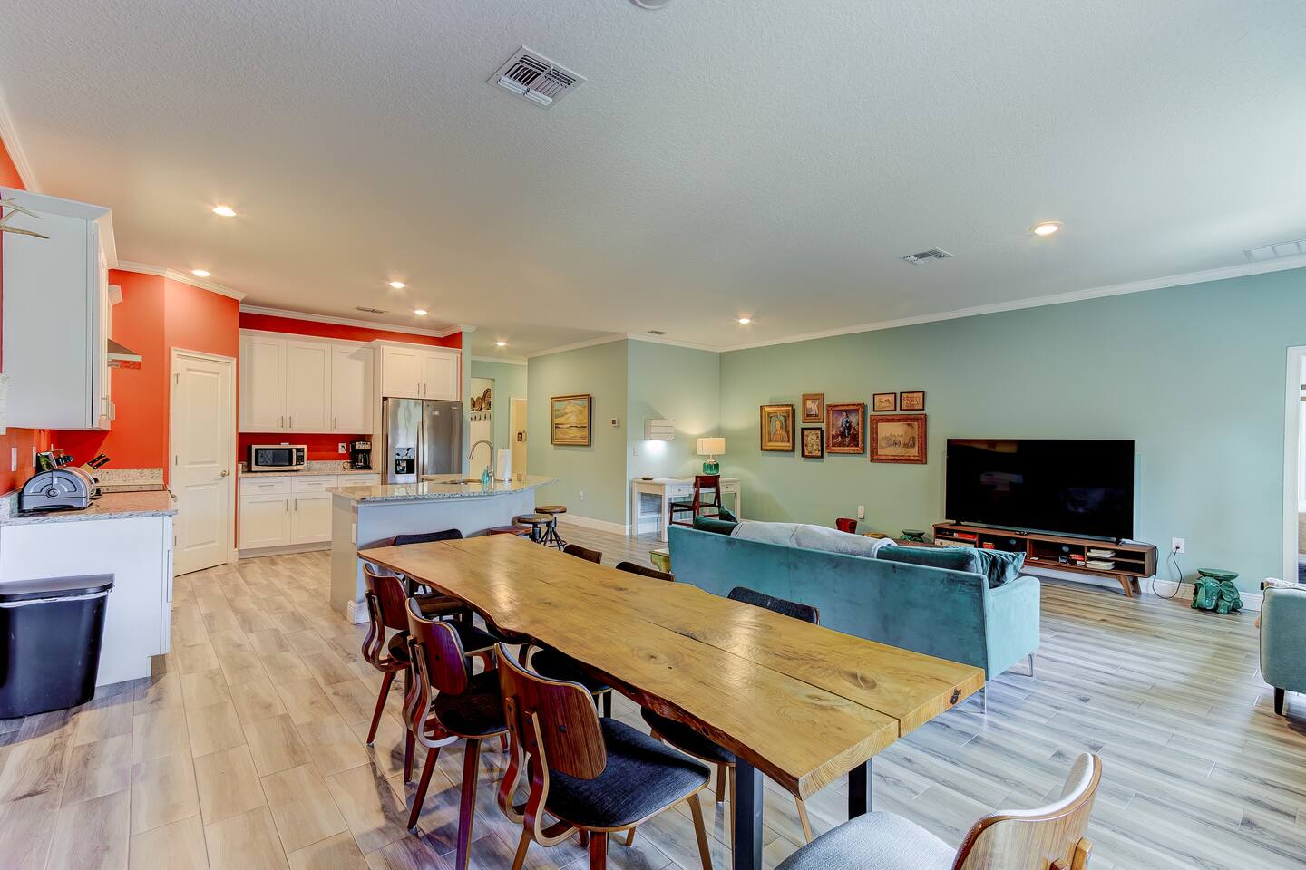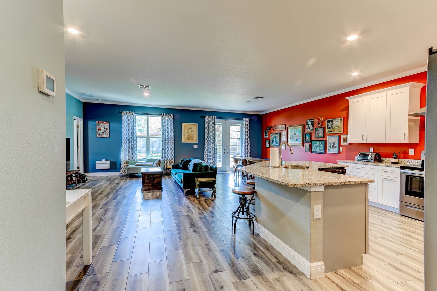 Make some memories at this unique and family-friendly house located in a quiet neighborhood. This house is brand-new, bright and sunny, and has an open floor-plan with 4 bedrooms and 3 full bathrooms. It's primarily designed for long-term stays: the beds and linens are comfy and the kitchen is well-stocked and ready for lots of home-cooked meals. The decor is fun and funky, with lots to look at. The 2-car garage is all yours, as is the spacious, fully-fenced backyard.