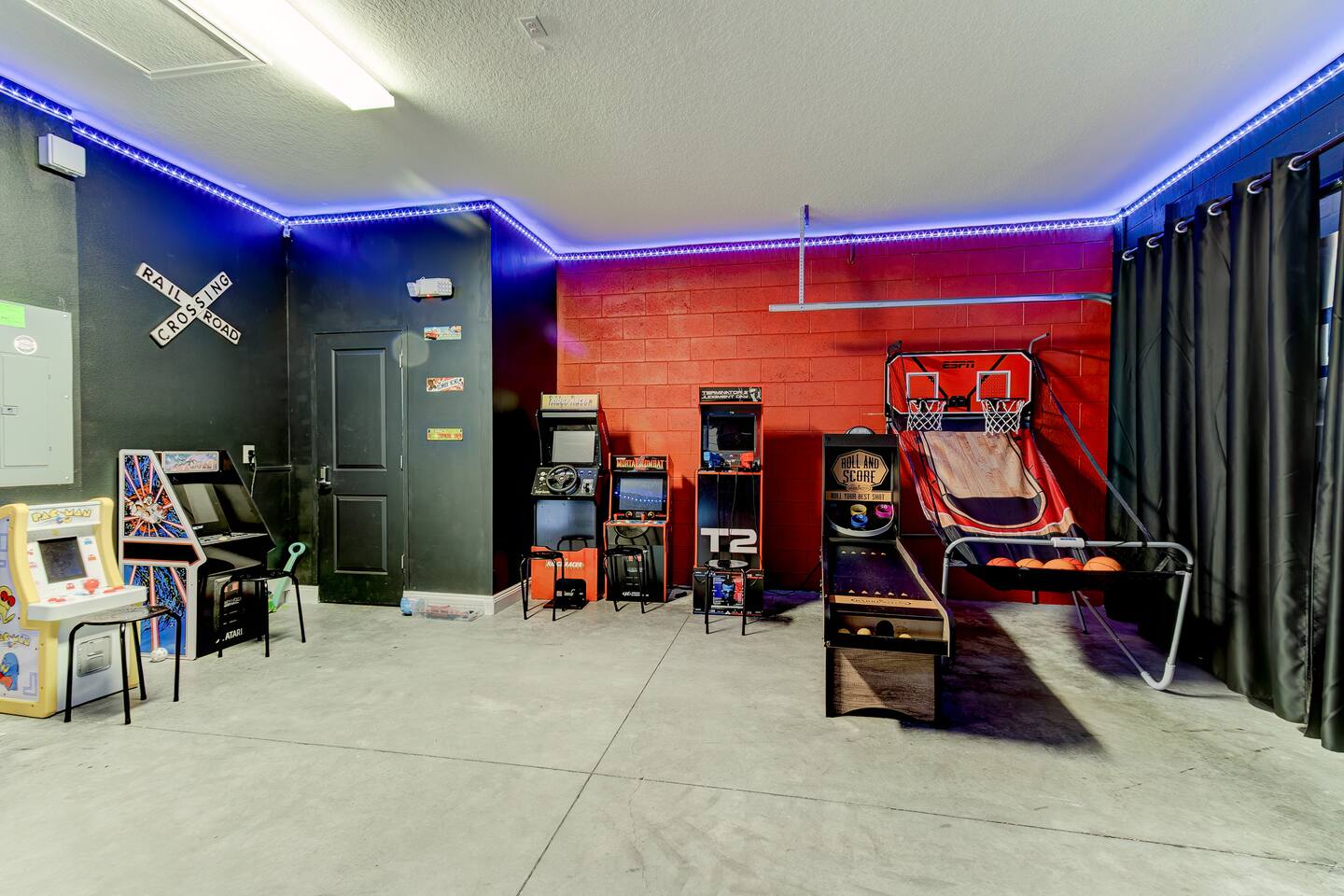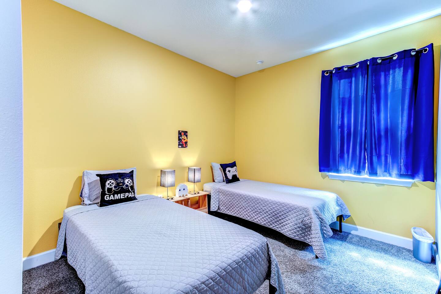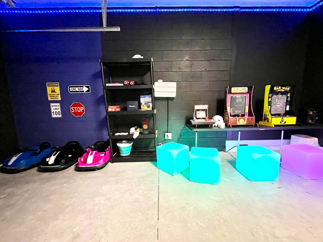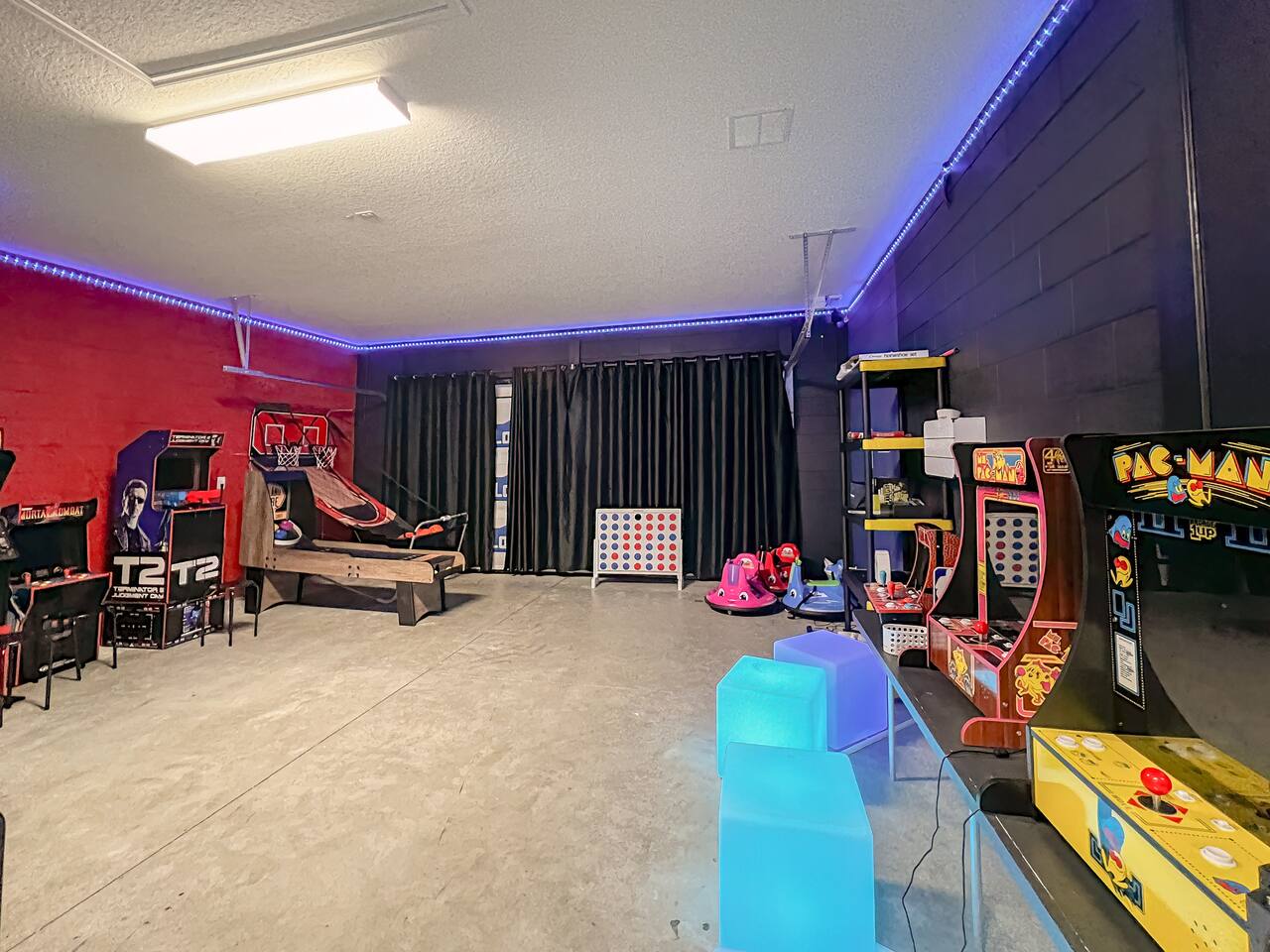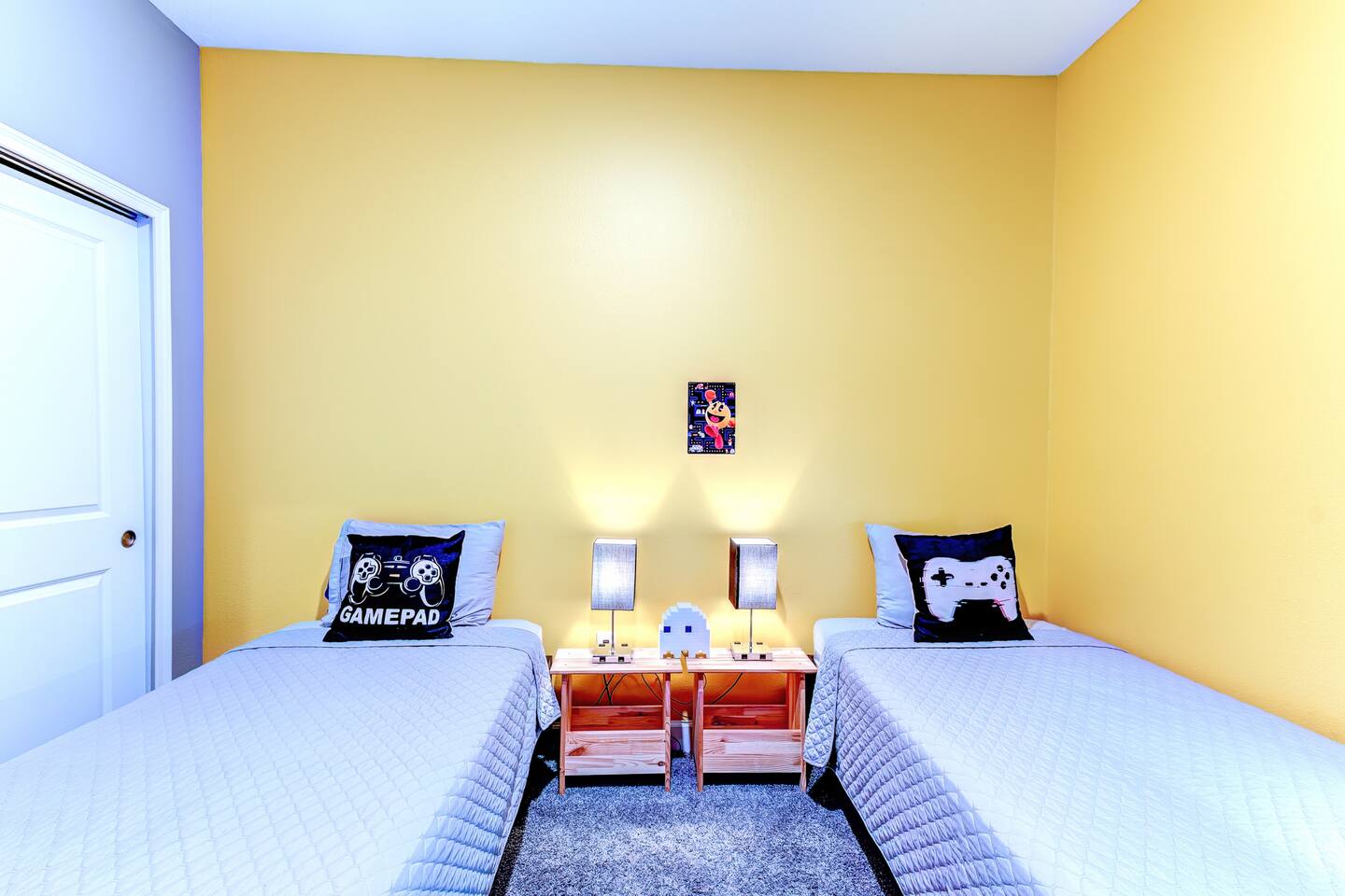 Welcome to this brand-new home with a spacious open floor plan! Step into the cozy living room, which flows seamlessly into the fully-stocked eat-in kitchen. Off the kitchen, you'll find the main bedroom suite featuring a king bed, a twin bed, a desk, and a private en-suite bathroom. On the other side of the living room are two additional bedrooms, each equipped with two extra-long twin beds that can be pushed together to create a king bed if desired. The second full bathroom with a tub is conveniently located by these 2 bedrooms. The highlight of this home is the converted garage—a retro game room packed with fun! Enjoy basketball free-throw, skeeball, and vintage arcade games to keep everyone entertained for hours. Outside, the fully-fenced backyard offers a dining table and a charcoal grill (charcoal provided), perfect for enjoying meals al fresco. This home is designed for fun, comfort, and unforgettable memories!