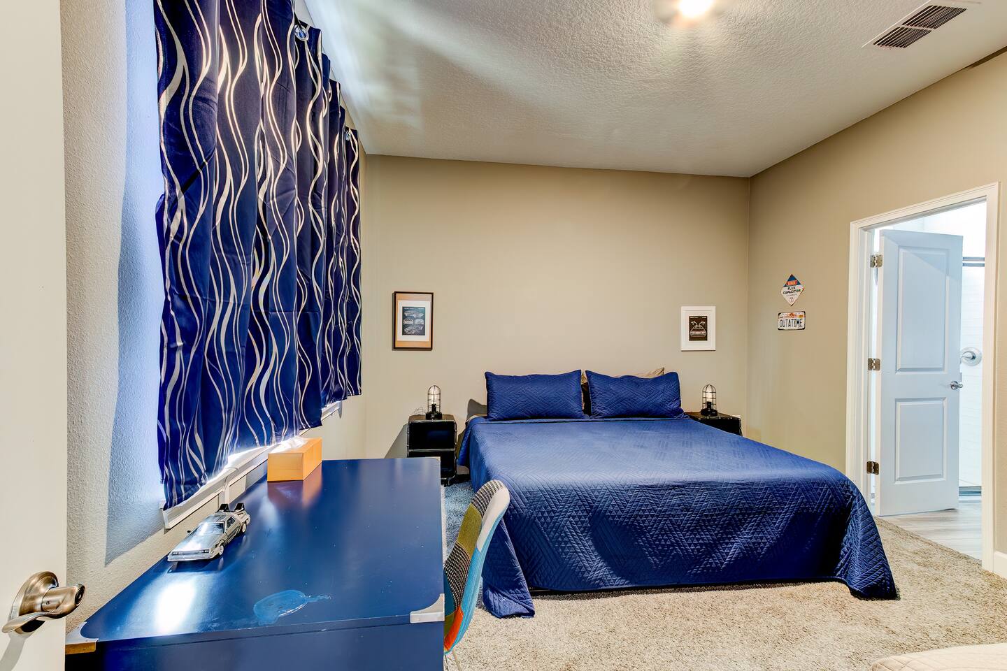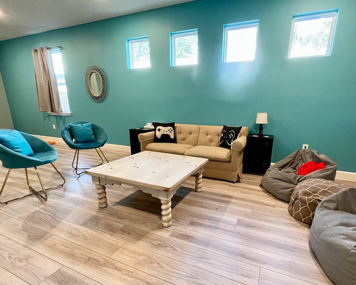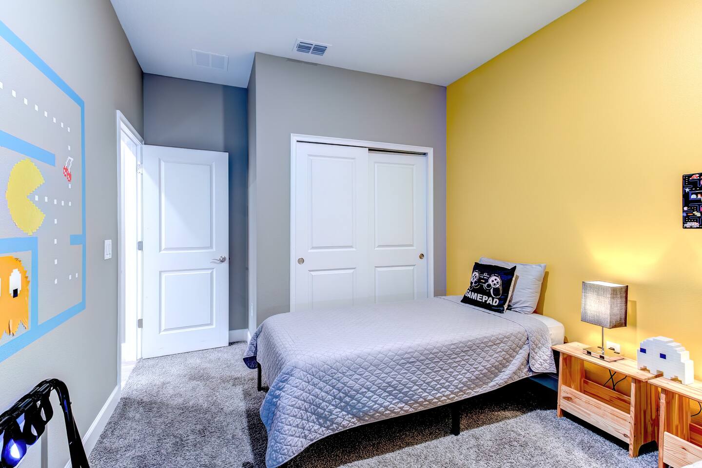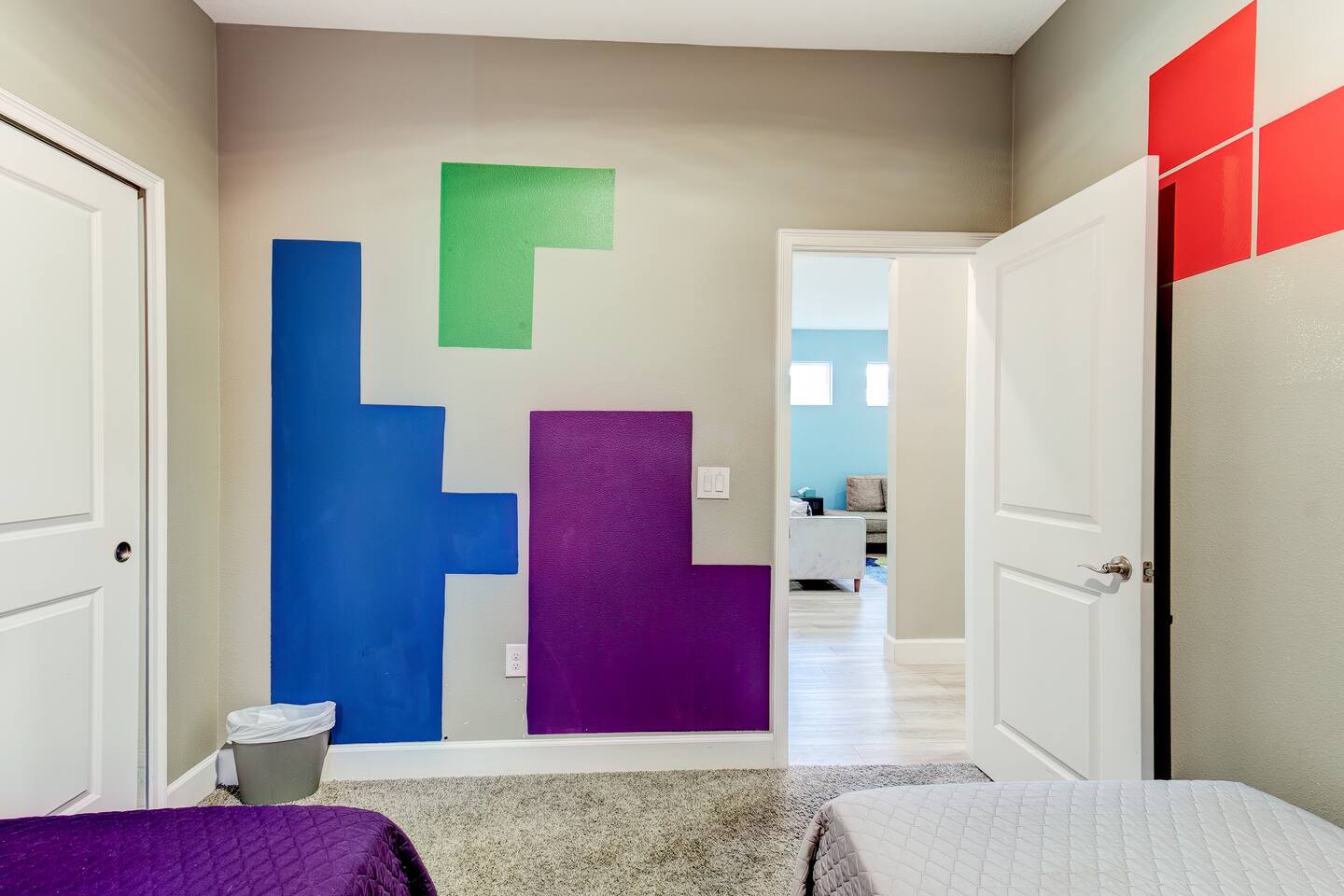 Welcome to this brand-new home with a spacious open floor plan! Step into the cozy living room, which flows seamlessly into the fully-stocked eat-in kitchen. Off the kitchen, you'll find the main bedroom suite featuring a king bed, a twin bed, a desk, and a private en-suite bathroom. On the other side of the living room are two additional bedrooms, each equipped with two extra-long twin beds that can be pushed together to create a king bed if desired. The second full bathroom with a tub is conveniently located by these 2 bedrooms. The highlight of this home is the converted garage—a retro game room packed with fun! Enjoy basketball free-throw, skeeball, and vintage arcade games to keep everyone entertained for hours. Outside, the fully-fenced backyard offers a dining table and a charcoal grill (charcoal provided), perfect for enjoying meals al fresco. This home is designed for fun, comfort, and unforgettable memories!