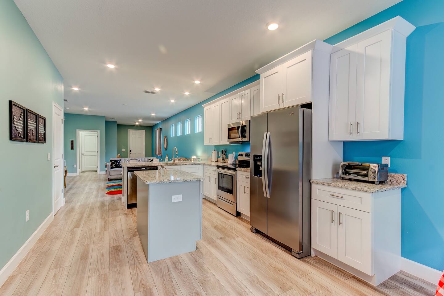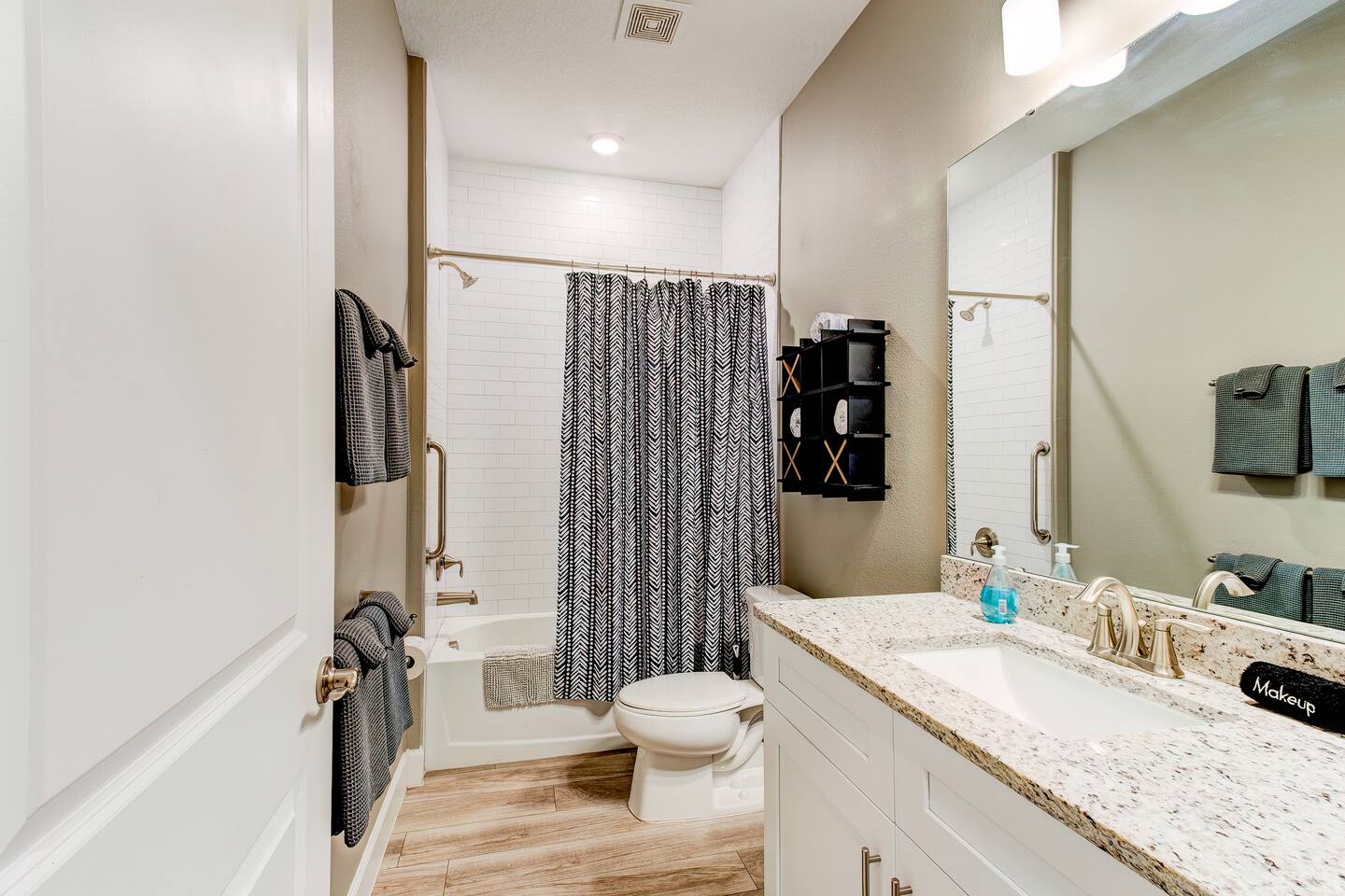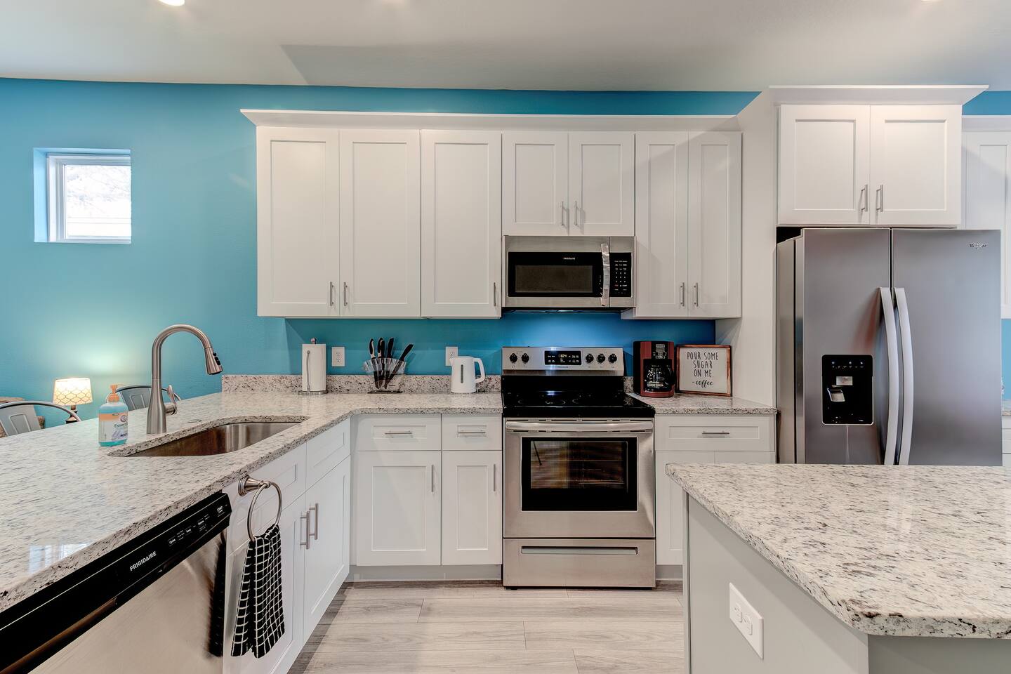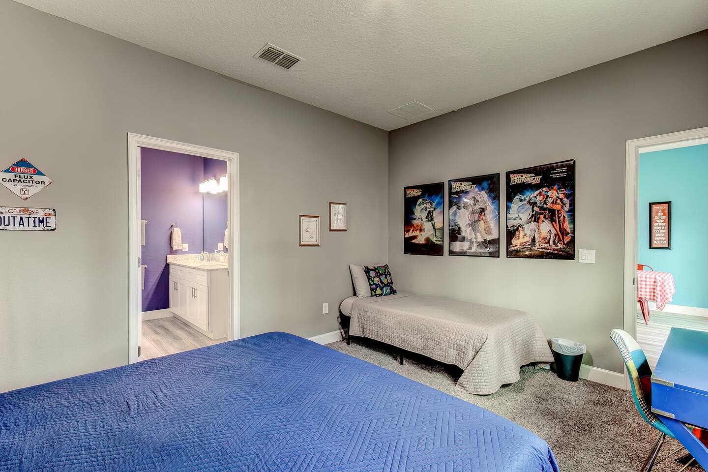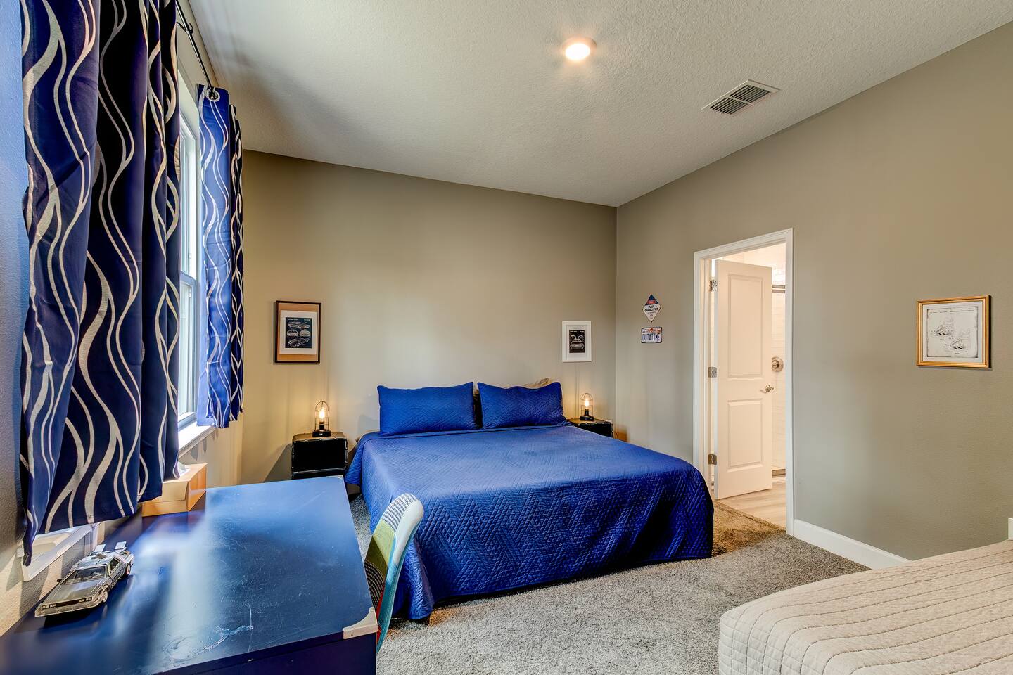 Welcome to this brand-new home with a spacious open floor plan! Step into the cozy living room, which flows seamlessly into the fully-stocked eat-in kitchen. Off the kitchen, you'll find the main bedroom suite featuring a king bed, a twin bed, a desk, and a private en-suite bathroom. On the other side of the living room are two additional bedrooms, each equipped with two extra-long twin beds that can be pushed together to create a king bed if desired. The second full bathroom with a tub is conveniently located by these 2 bedrooms. The highlight of this home is the converted garage—a retro game room packed with fun! Enjoy basketball free-throw, skeeball, and vintage arcade games to keep everyone entertained for hours. Outside, the fully-fenced backyard offers a dining table and a charcoal grill (charcoal provided), perfect for enjoying meals al fresco. This home is designed for fun, comfort, and unforgettable memories!