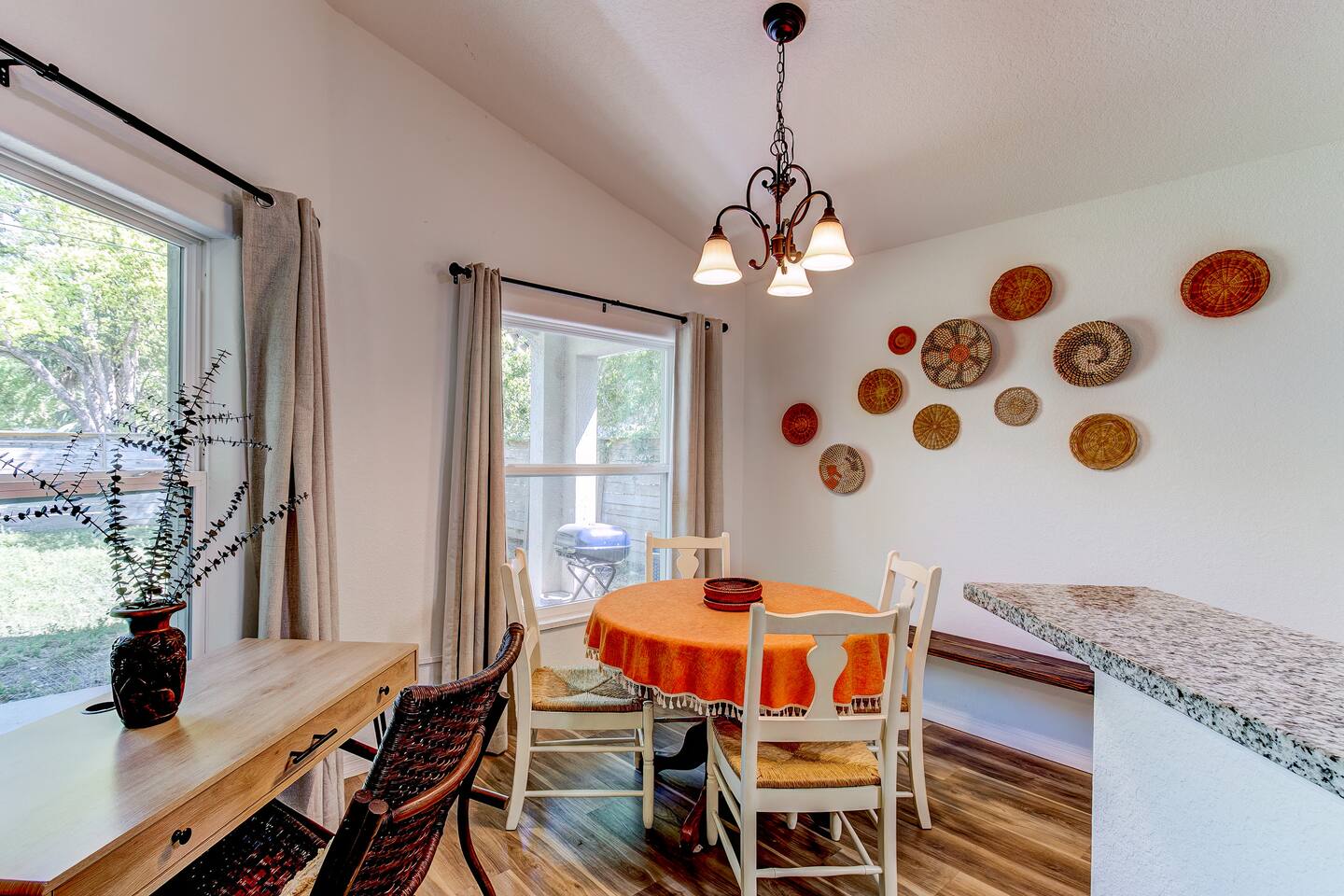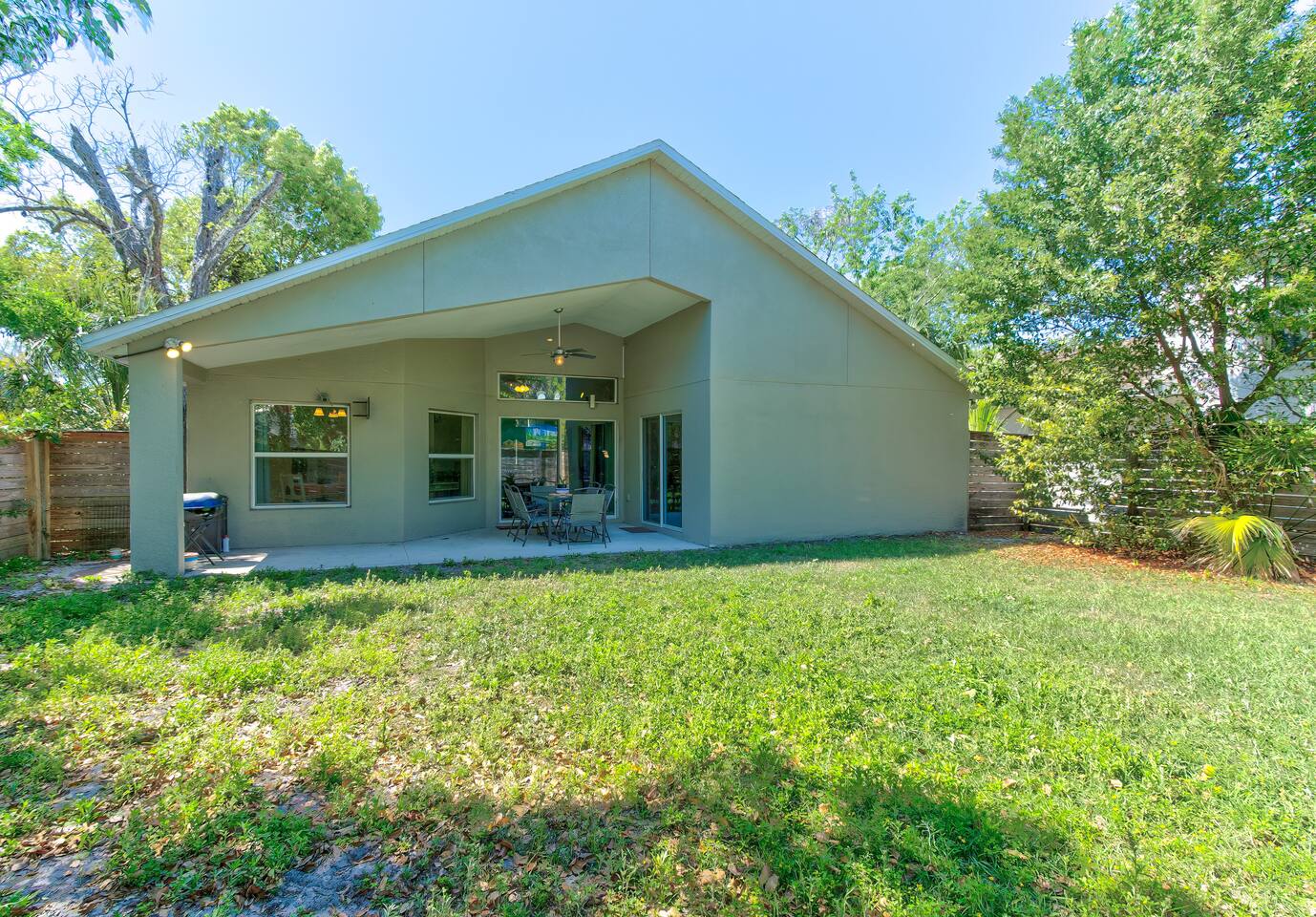 The single-story house with 20' vaulted ceilings has an open floor-plan with an eat-in kitchen and living/dining area. All 3 bedrooms are located off of this main area. The master bedroom has a king bed and twin daybed, plus a master bathroom with separate shower and tub. The other two bedrooms are a "Jack and Jill" setup, meaning that they share a bathroom. The house is equipped with central air, and it is more than sufficient to keep it icy cool if that's how you like it. You'll be sure to enjoy the privacy-fenced backyard with a dining table and grill.